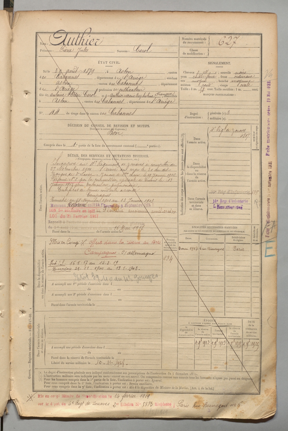 | Authier | Pierre Jules dit Carol | FOIX | 1 R 457 | 1899 | Aston | Aston | 627 |