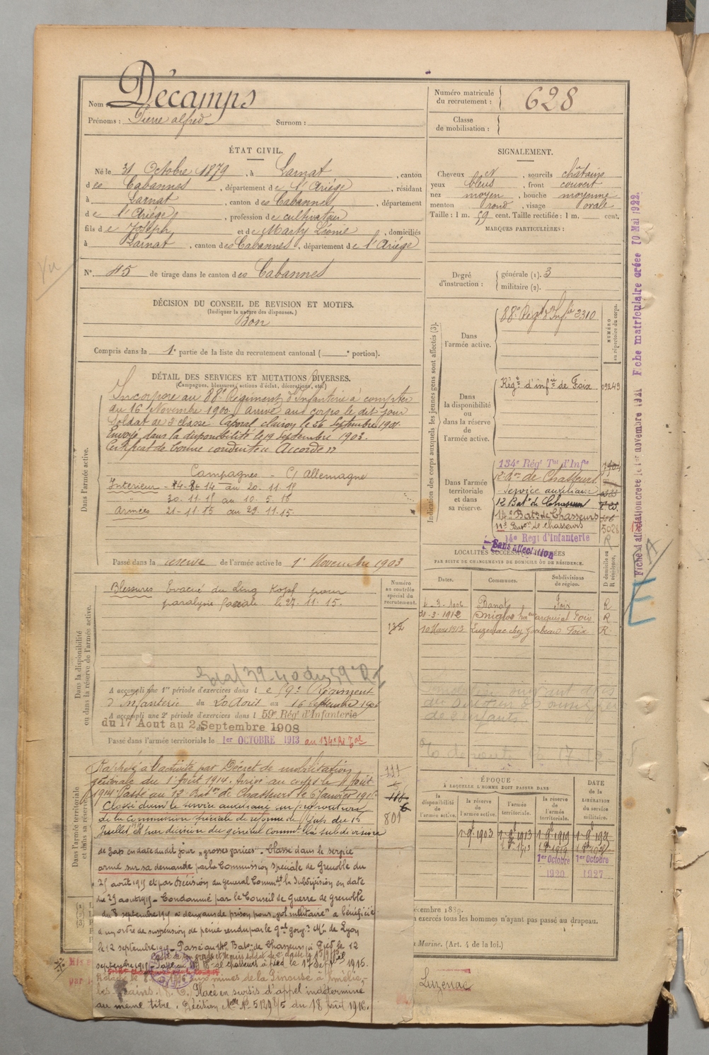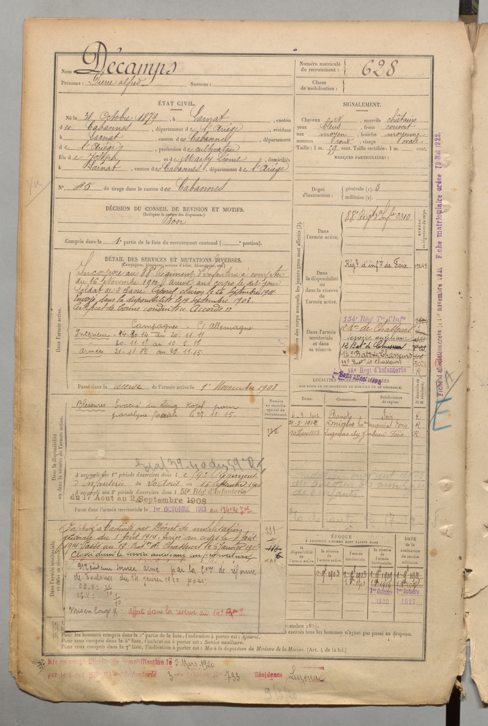 | Décamps | Pierre Alfred | FOIX | 1 R 457 | 1899 | Larnat | Larnat | 628 |