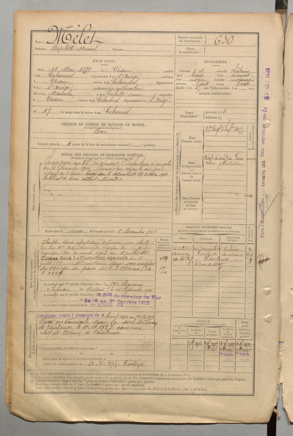 | Mélet | Baptiste Marius | FOIX | 1 R 457 | 1899 | Verdun | Verdun | 630 |