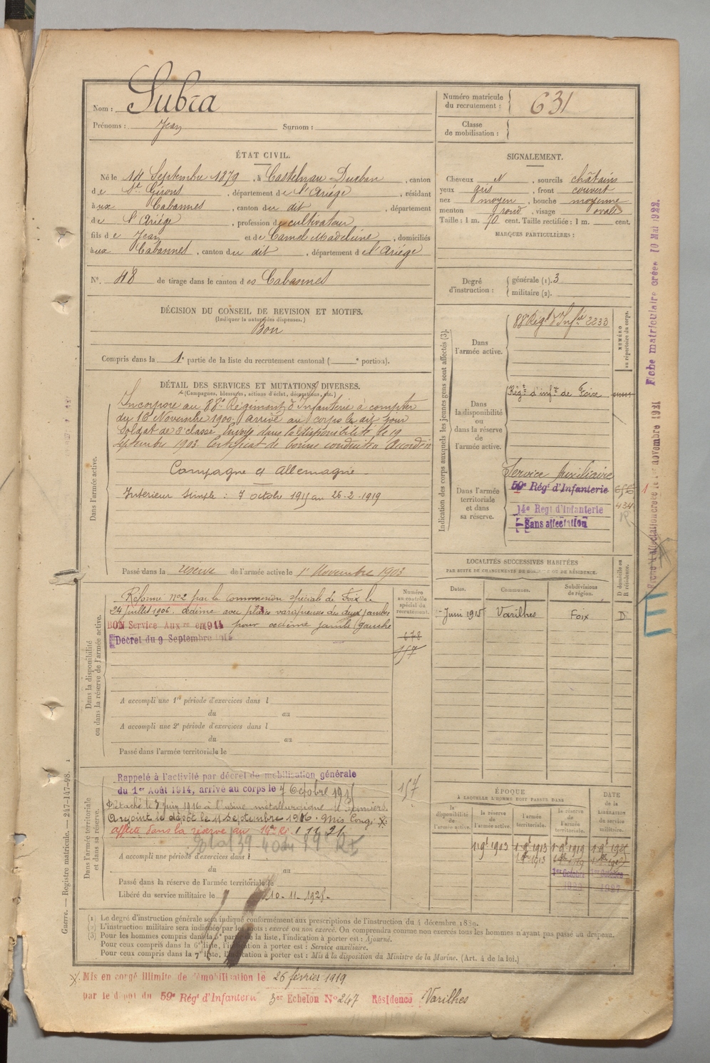 | Subra | Jean | FOIX | 1 R 457 | 1899 | Castelnau-Durban | Cabannes (Les) | 631 |