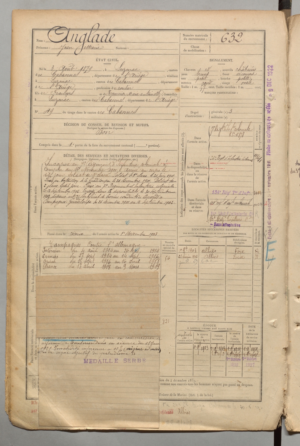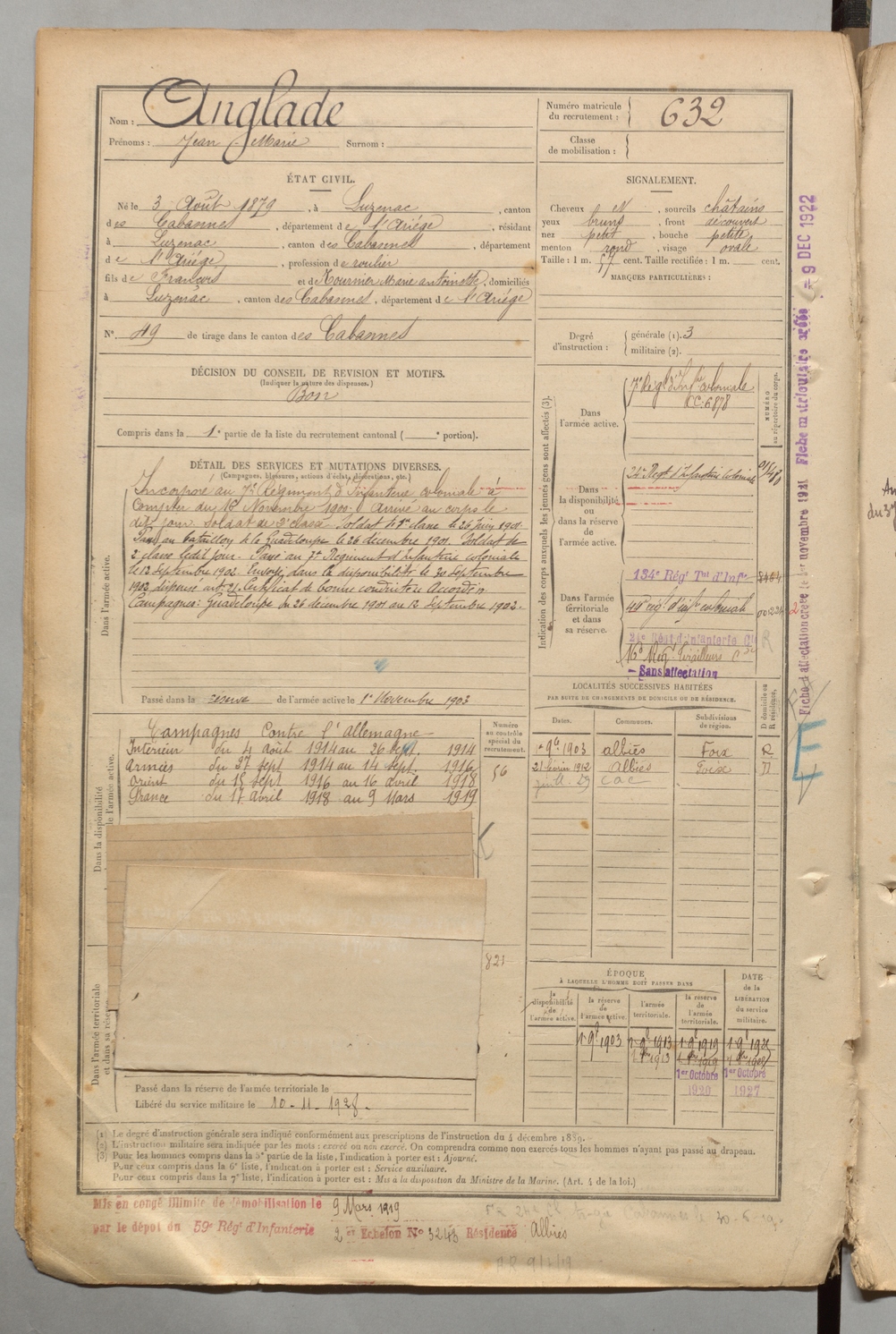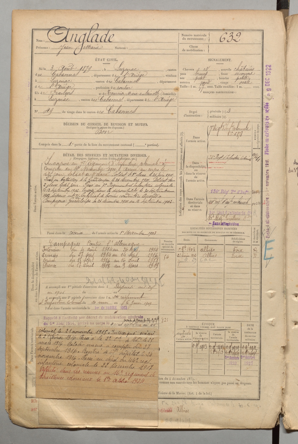 | Anglade | Jean Marie | FOIX | 1 R 457 | 1899 | Luzenac | Luzenac | 632 |