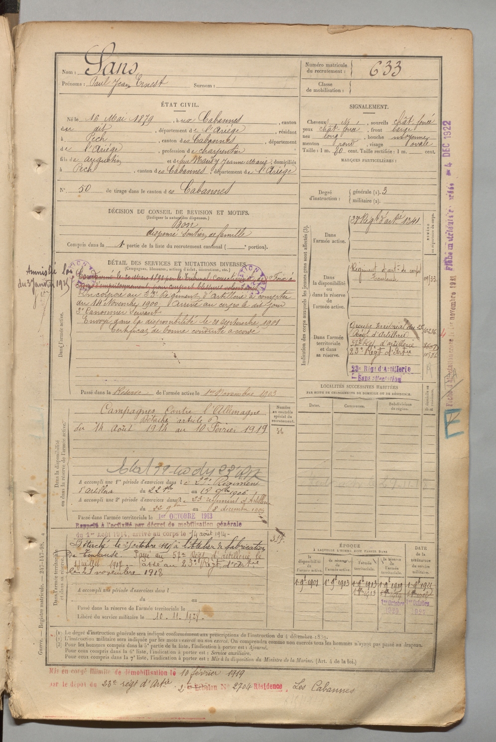 | Sans | Paul Jean Ernest | FOIX | 1 R 457 | 1899 | Cabannes (Les) | Pech | 633 |