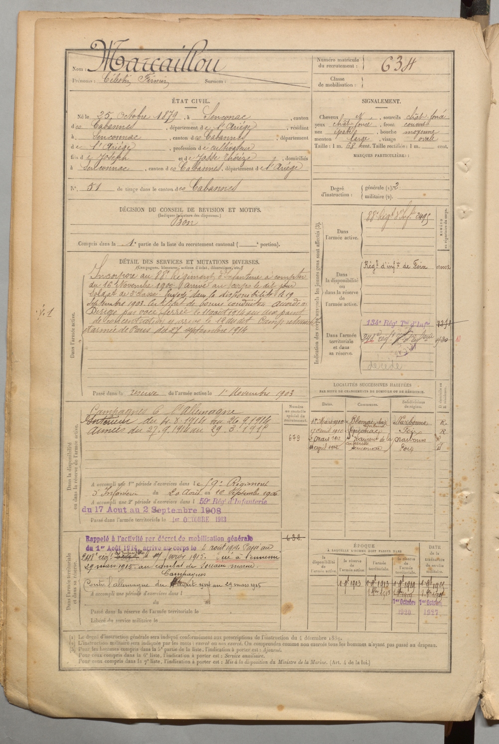 | Marcailloiu | Célestin Firmin | FOIX | 1 R 457 | 1899 | Senconac | Senconac | 634 |