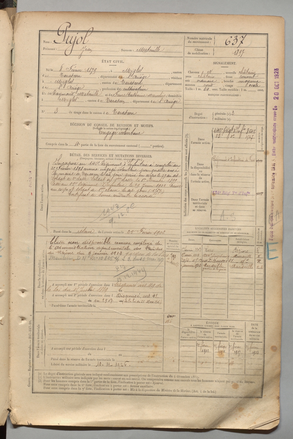 | Pujol | Jean dit Matouille | FOIX | 1 R 457 | 1899 | Miglos | Miglos | 637 |