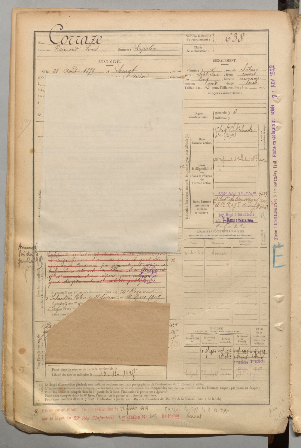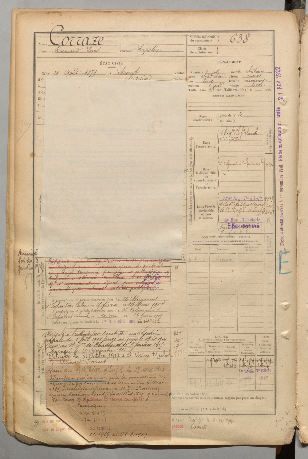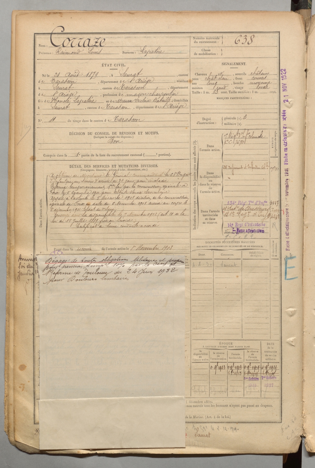 | Corraze | Raimond Louis dit Lapatère | FOIX | 1 R 457 | 1899 | Saurat | Saurat | 638 |