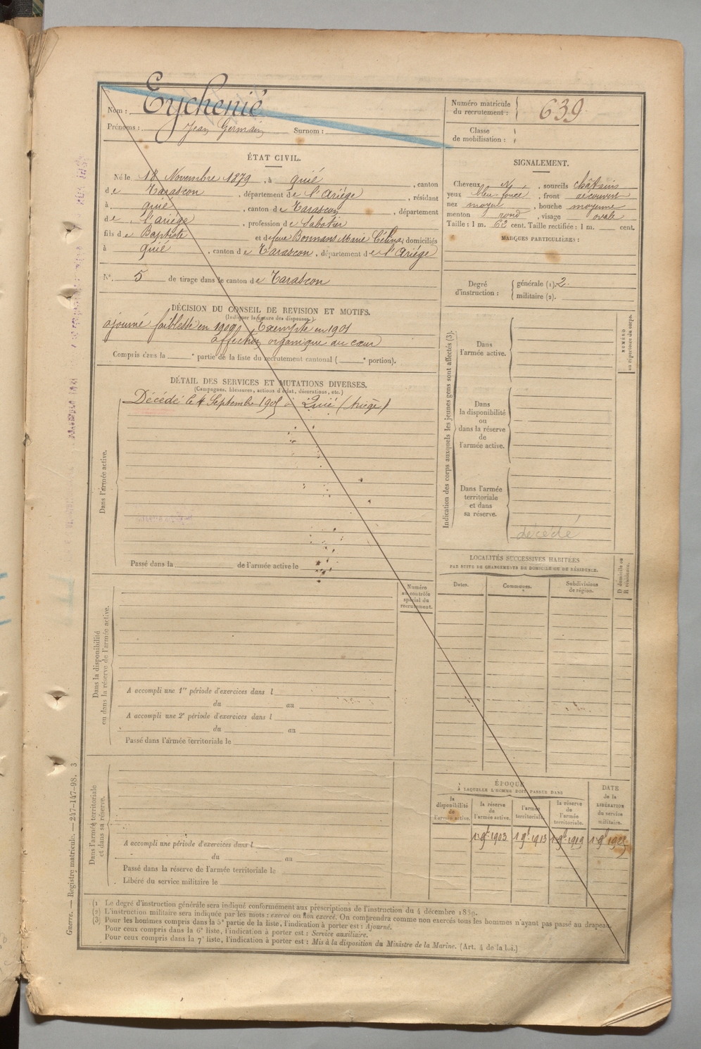 | Eychenié | Jean Germain | FOIX | 1 R 457 | 1899 | Quié | Quié | 639 |