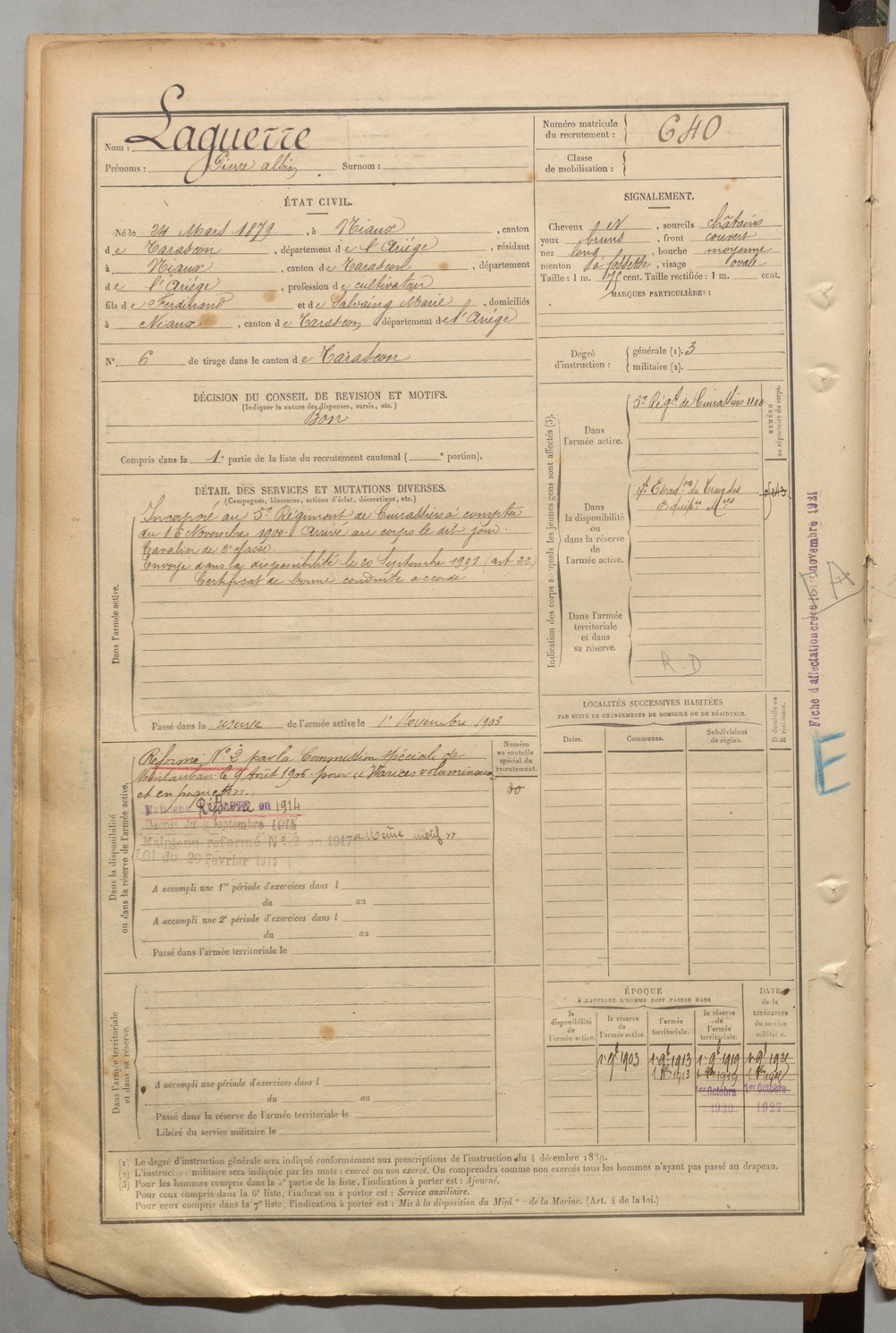 | Laguerre | Pierre Albin | FOIX | 1 R 457 | 1899 | Niaux | Niaux | 640 |