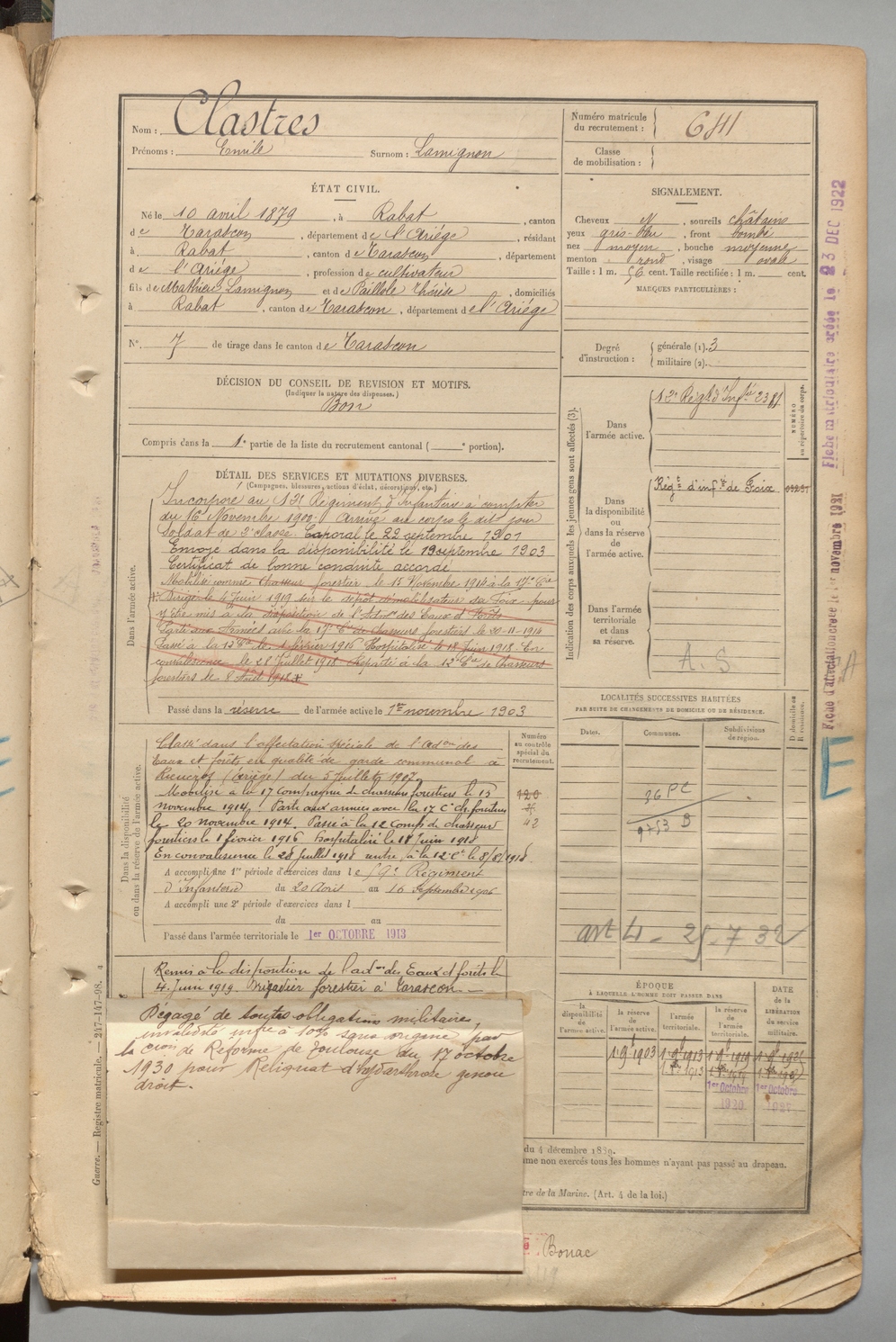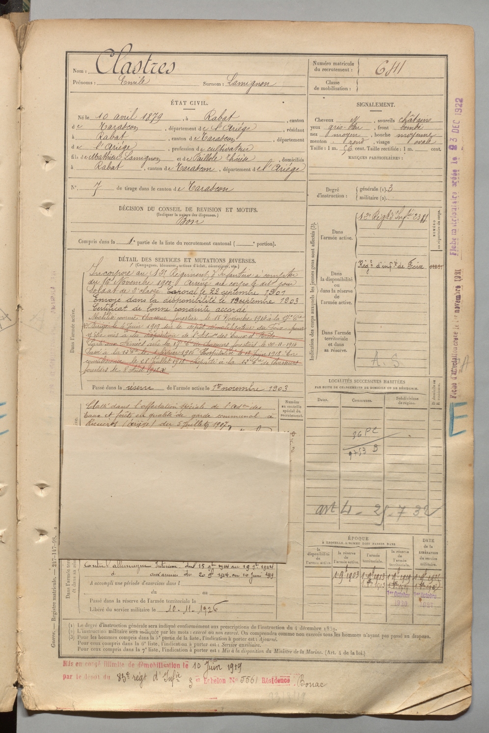 | Clastres | Emile dit Lamignon | FOIX | 1 R 457 | 1899 | Rabat-les-Trois-Seigneurs | Rabat-les-Trois-Seigneurs | 641 |