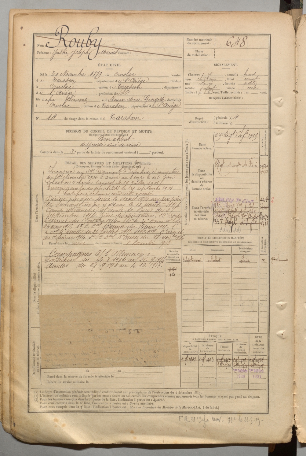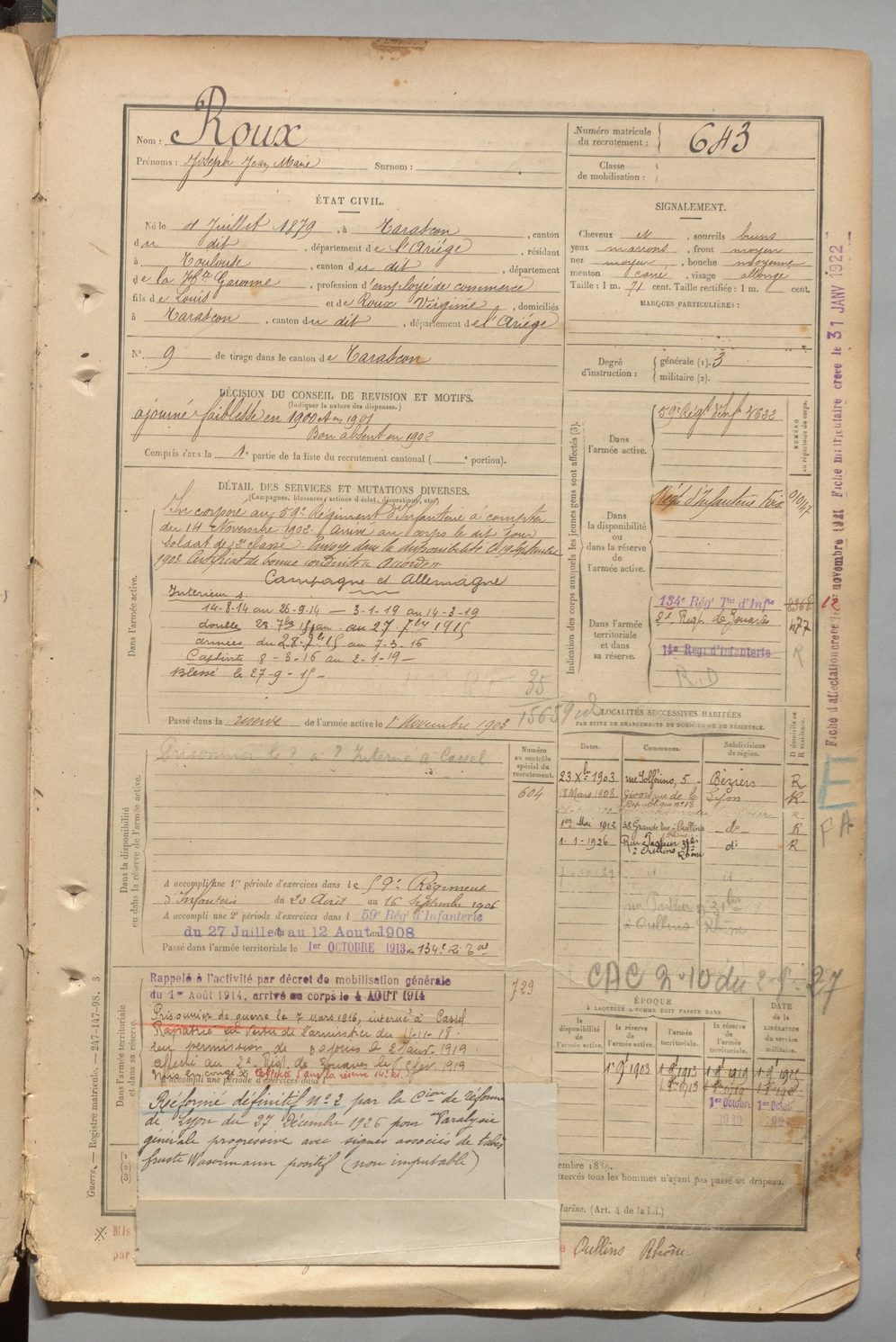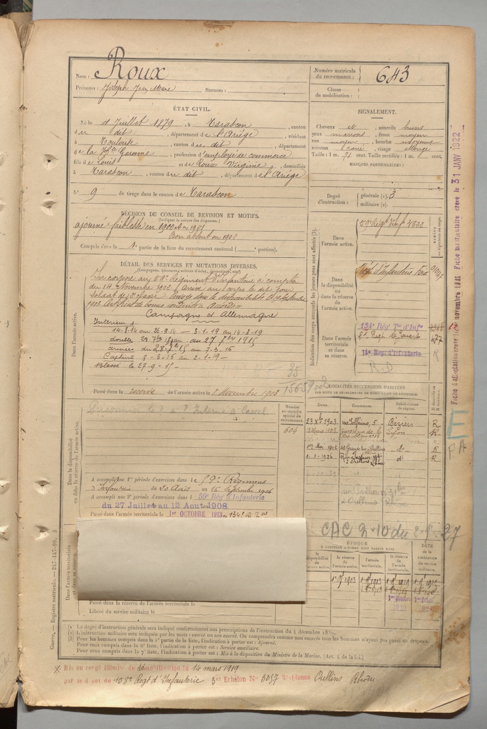 | Roux | Joseph Jean Marie | FOIX | 1 R 457 | 1899 | Tarascon | Toulouse | 643 |