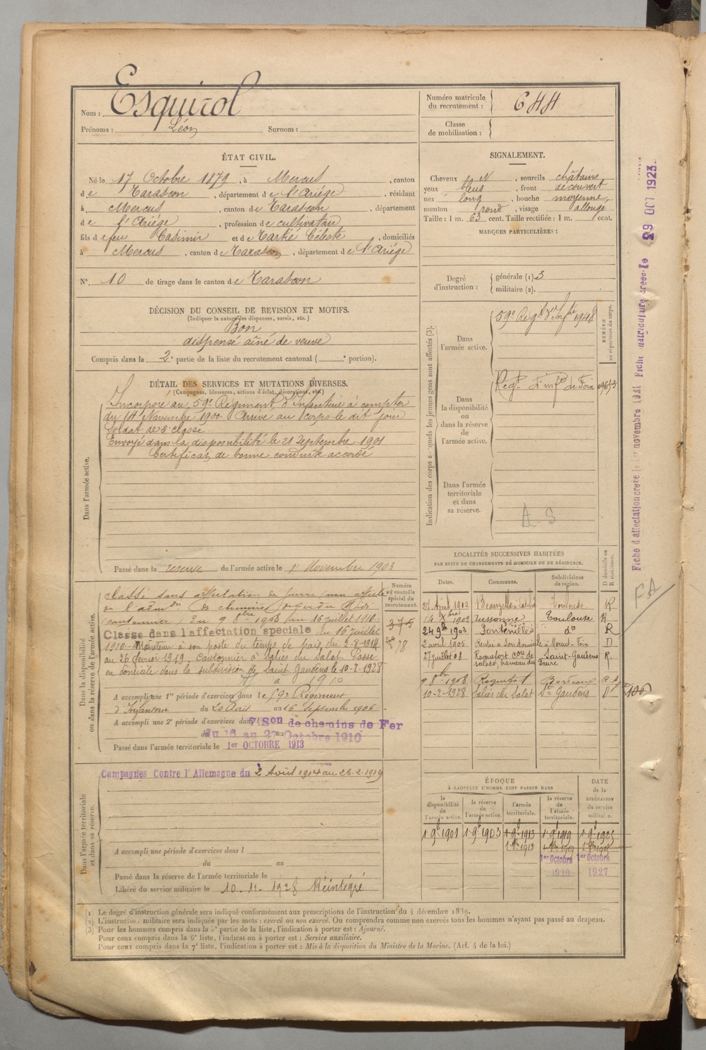 | Esquirol | Léon | FOIX | 1 R 457 | 1899 | Mercus-Garrabet | Mercus-Garrabet | 644 |