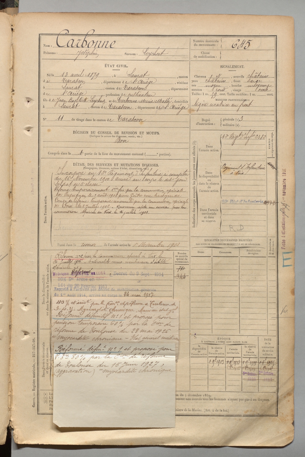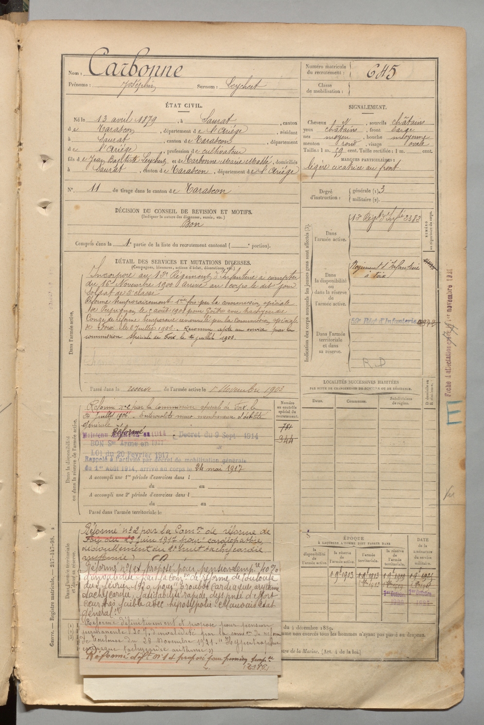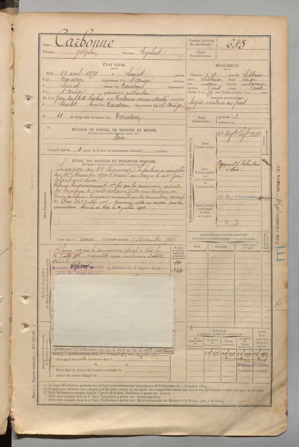 | Carbonne | Joséphin dit Leychert | FOIX | 1 R 457 | 1899 | Saurat | Saurat | 645 |