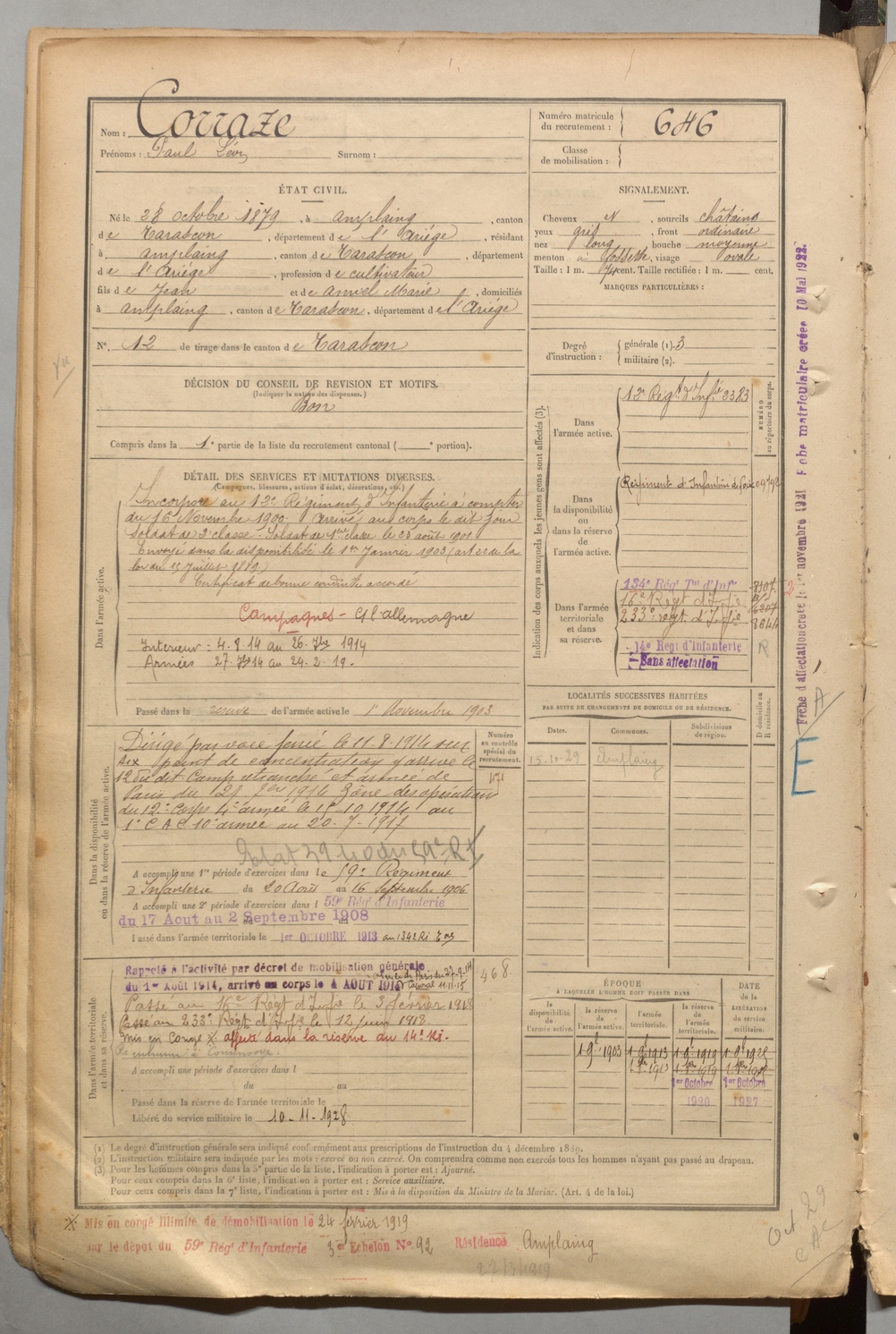 | Corraze | Paul Léon | FOIX | 1 R 457 | 1899 | Amplaing | Amplaing | 646 |