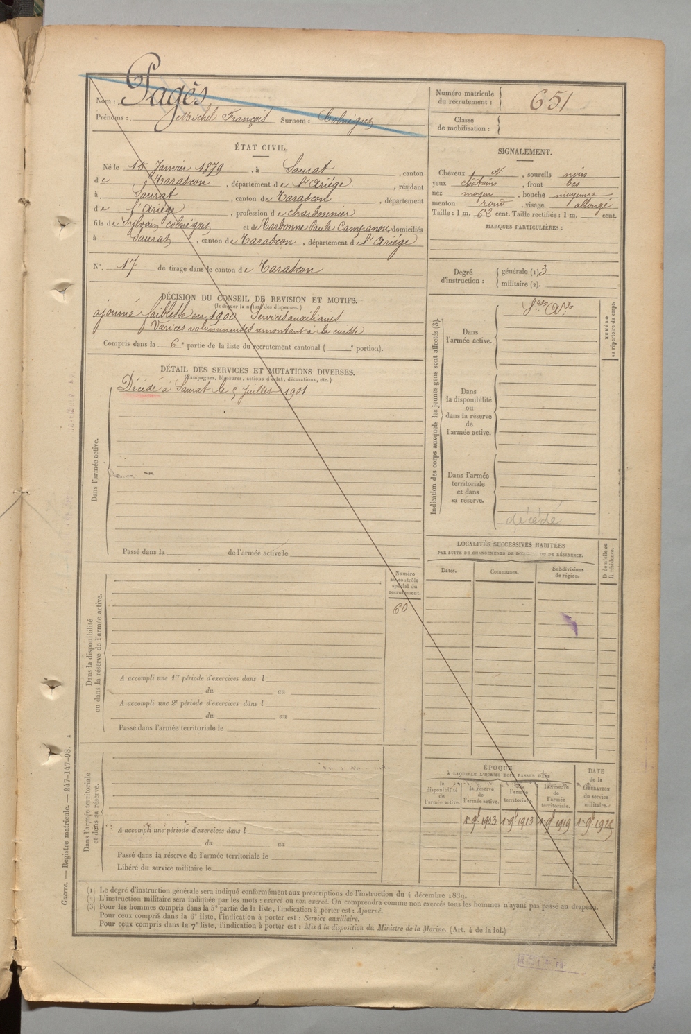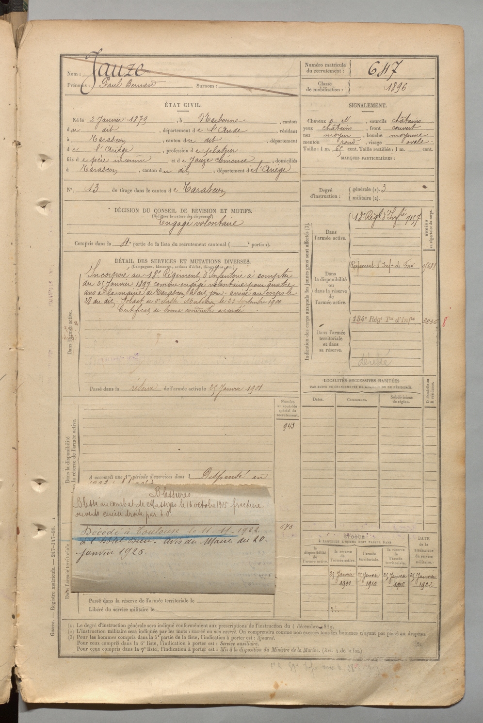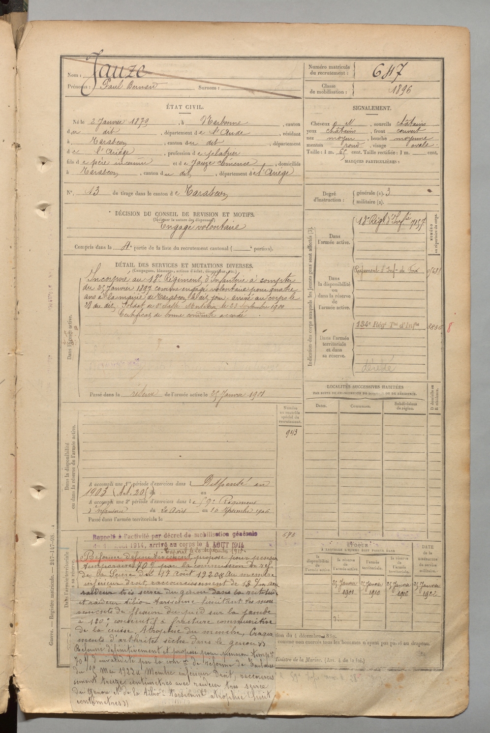 | Jauze | Paul Bernard | FOIX | 1 R 457 | 1899 | Narbonne | Tarascon | 647 |