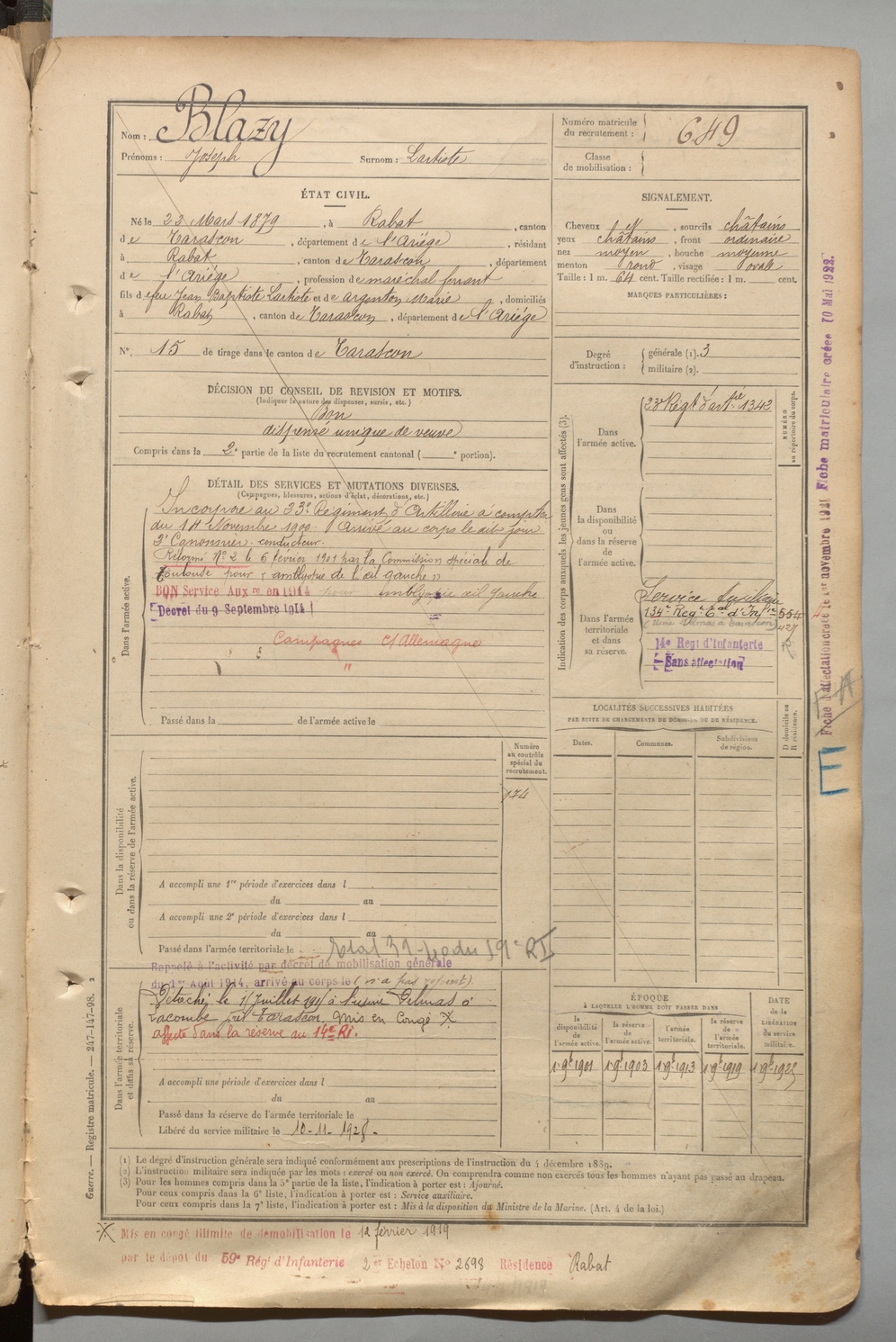 | Blazy | Joseph dit Lartiste | FOIX | 1 R 457 | 1899 | Rabat-les-Trois-Seigneurs | Rabat-les-Trois-Seigneurs | 649 |