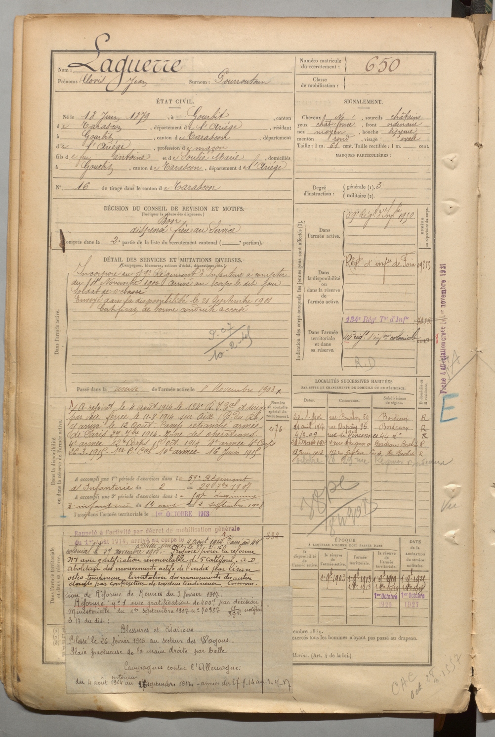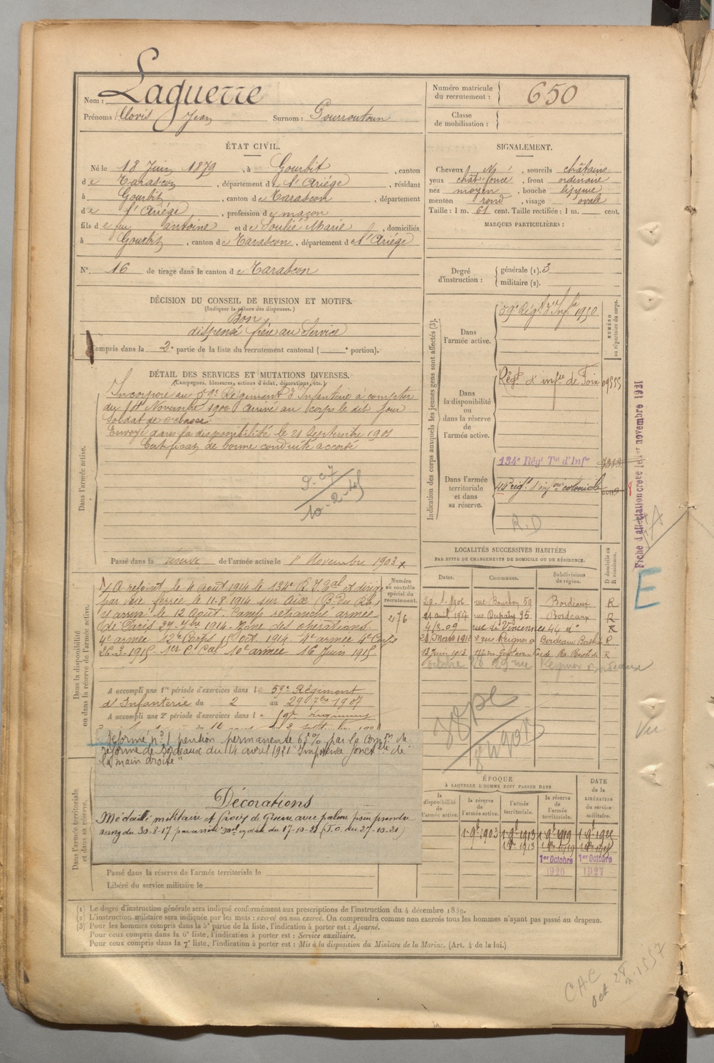 | Laguerre | Clovis Jean dit Pourroutoun | FOIX | 1 R 457 | 1899 | Gourbit | Gourbit | 650 |