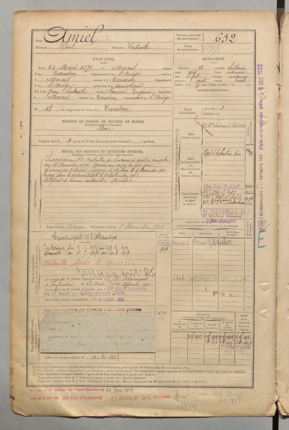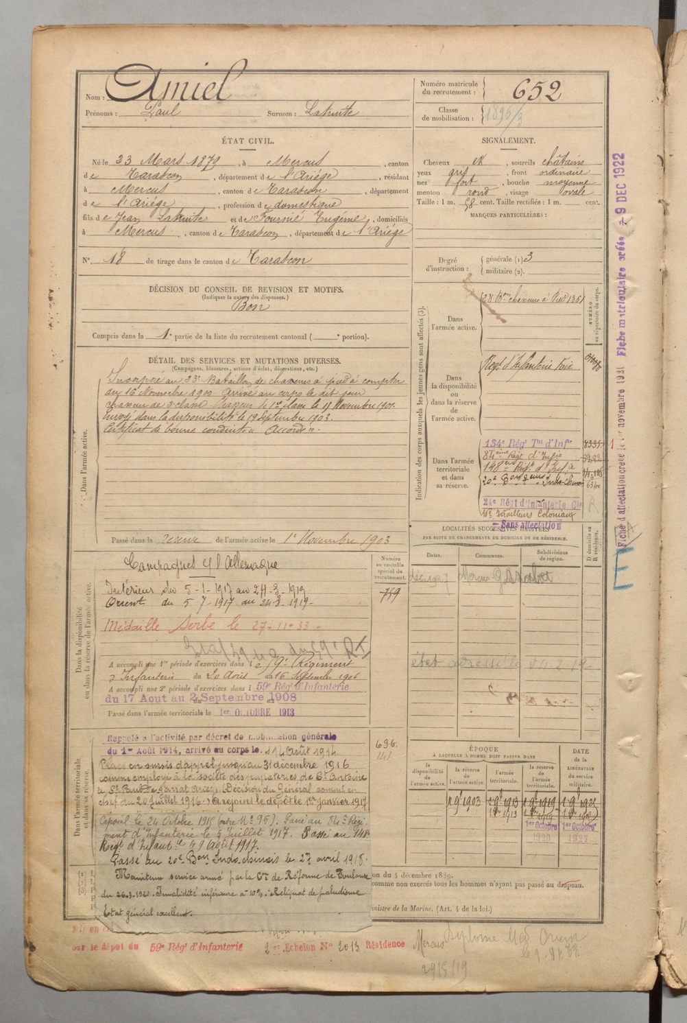 | Amiel | Paul dit Latruite | FOIX | 1 R 457 | 1899 | Mercus-Garrabet | Mercus-Garrabet | 652 |