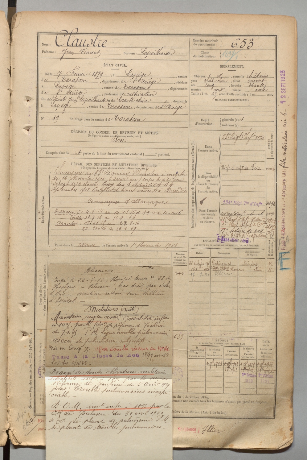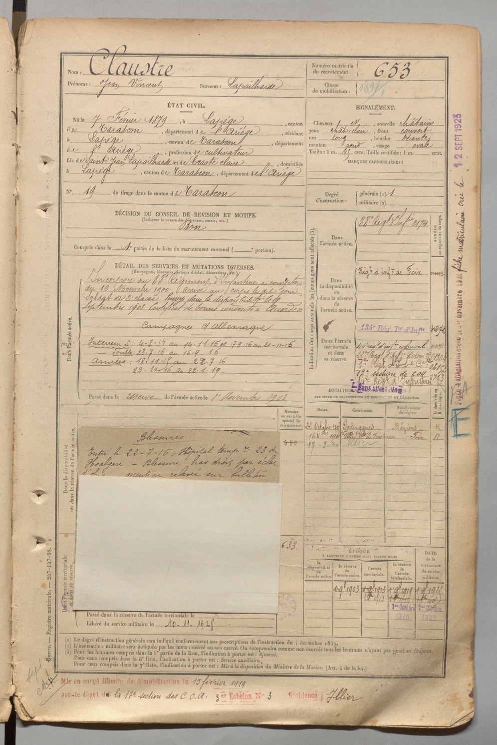 | Claustre | Jean Vincent dit Lapailharde | FOIX | 1 R 457 | 1899 | Lapège | Lapège | 653 |