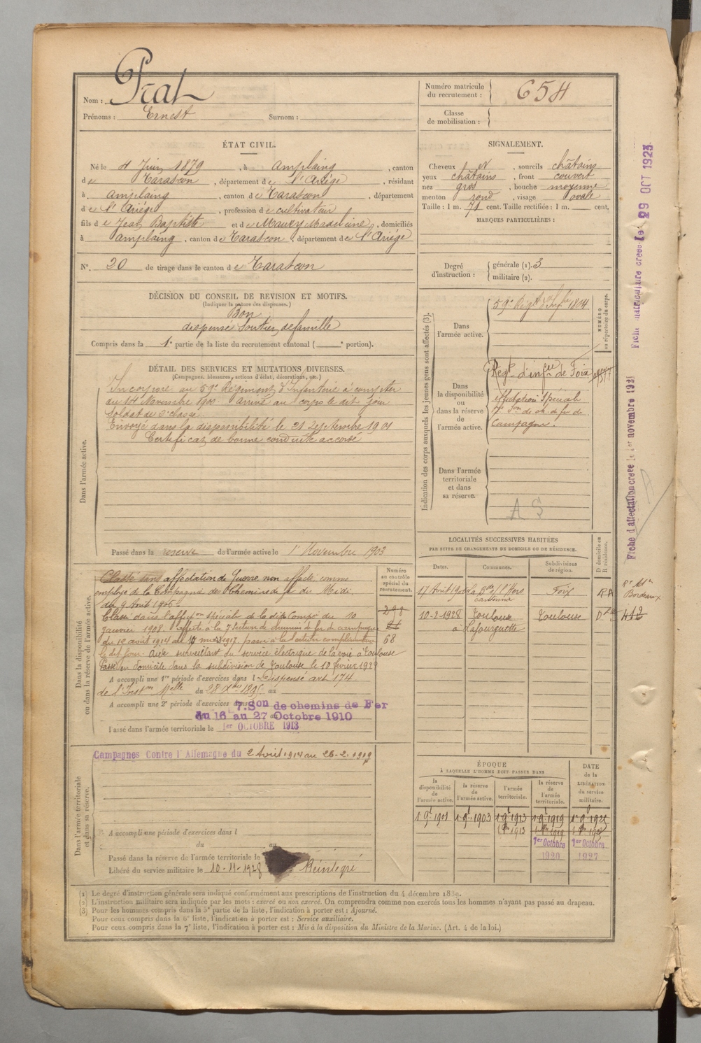 | Prat | Ernest | FOIX | 1 R 457 | 1899 | Amplaing | Amplaing | 654 |