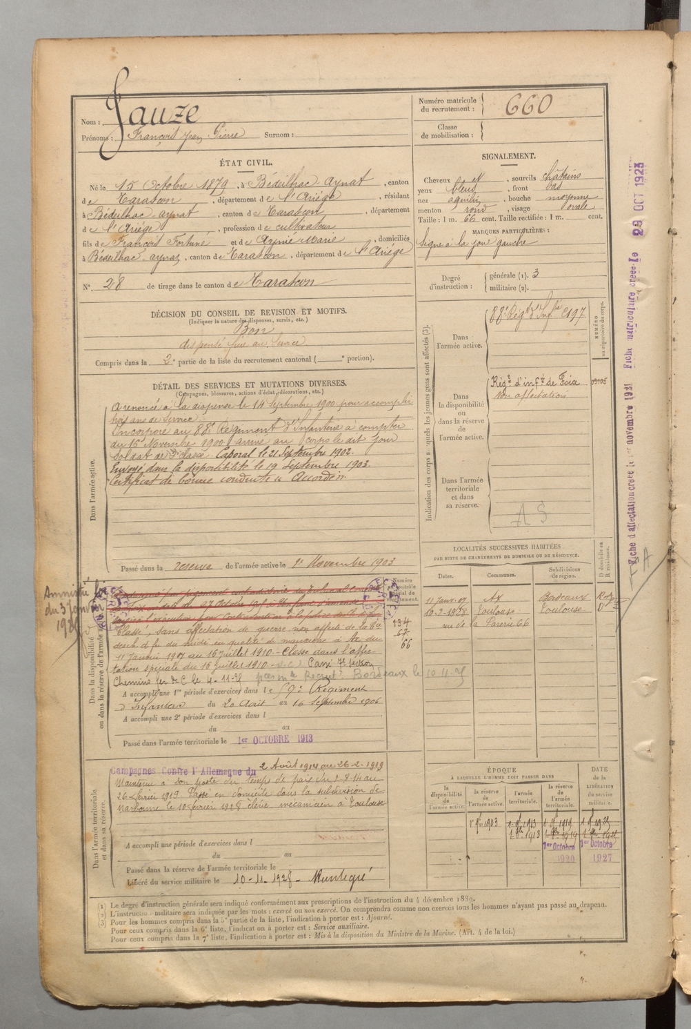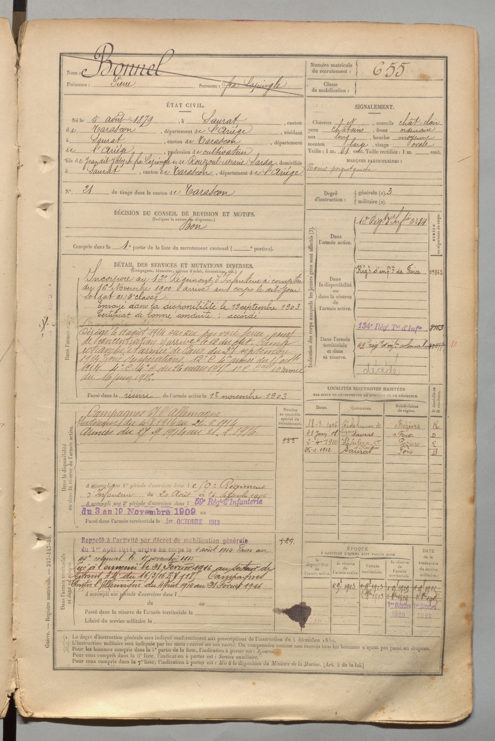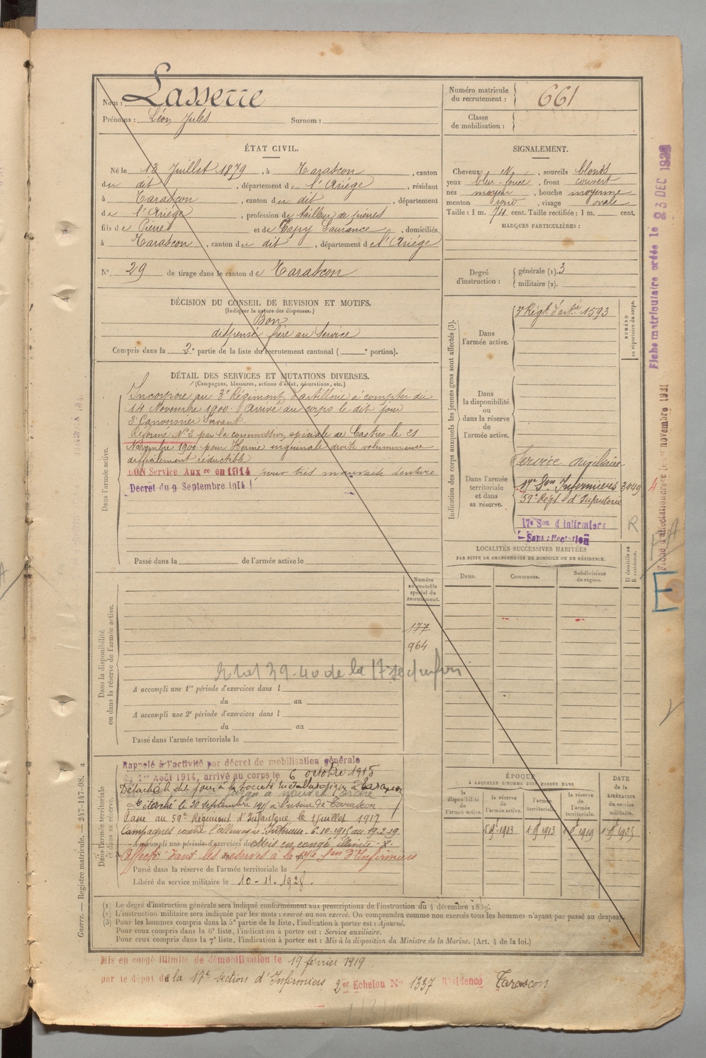 | Lasserre | Léon Jules | FOIX | 1 R 457 | 1899 | Tarascon | Tarascon | 661 |