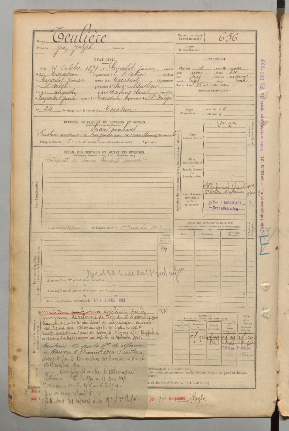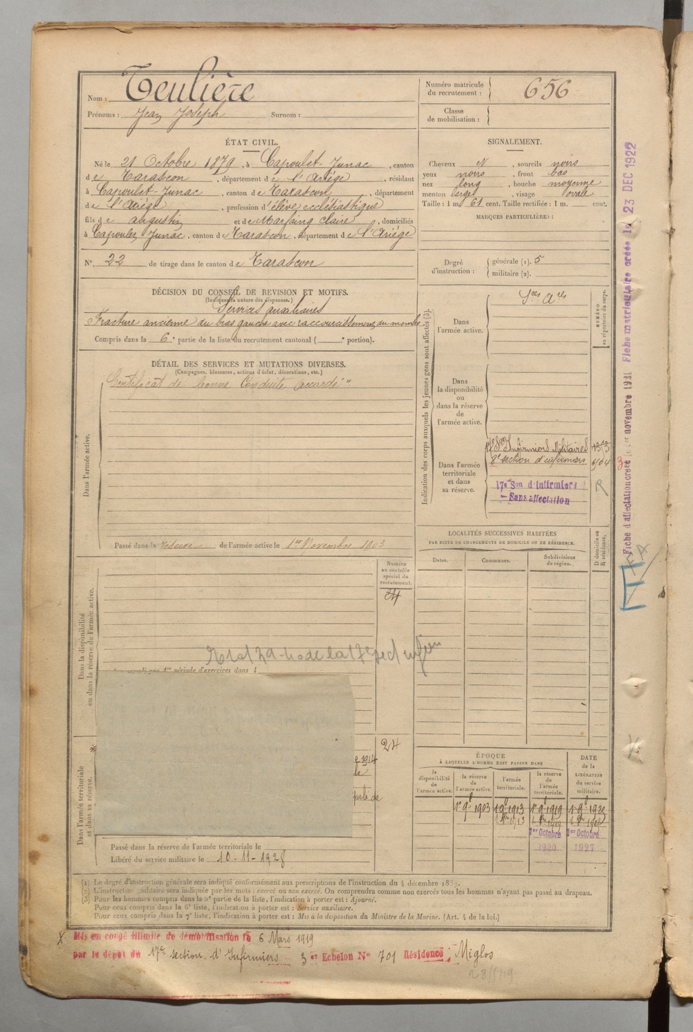 | Teulière | Jean Joseph | FOIX | 1 R 457 | 1899 | Capoulet | Capoulet | 656 |