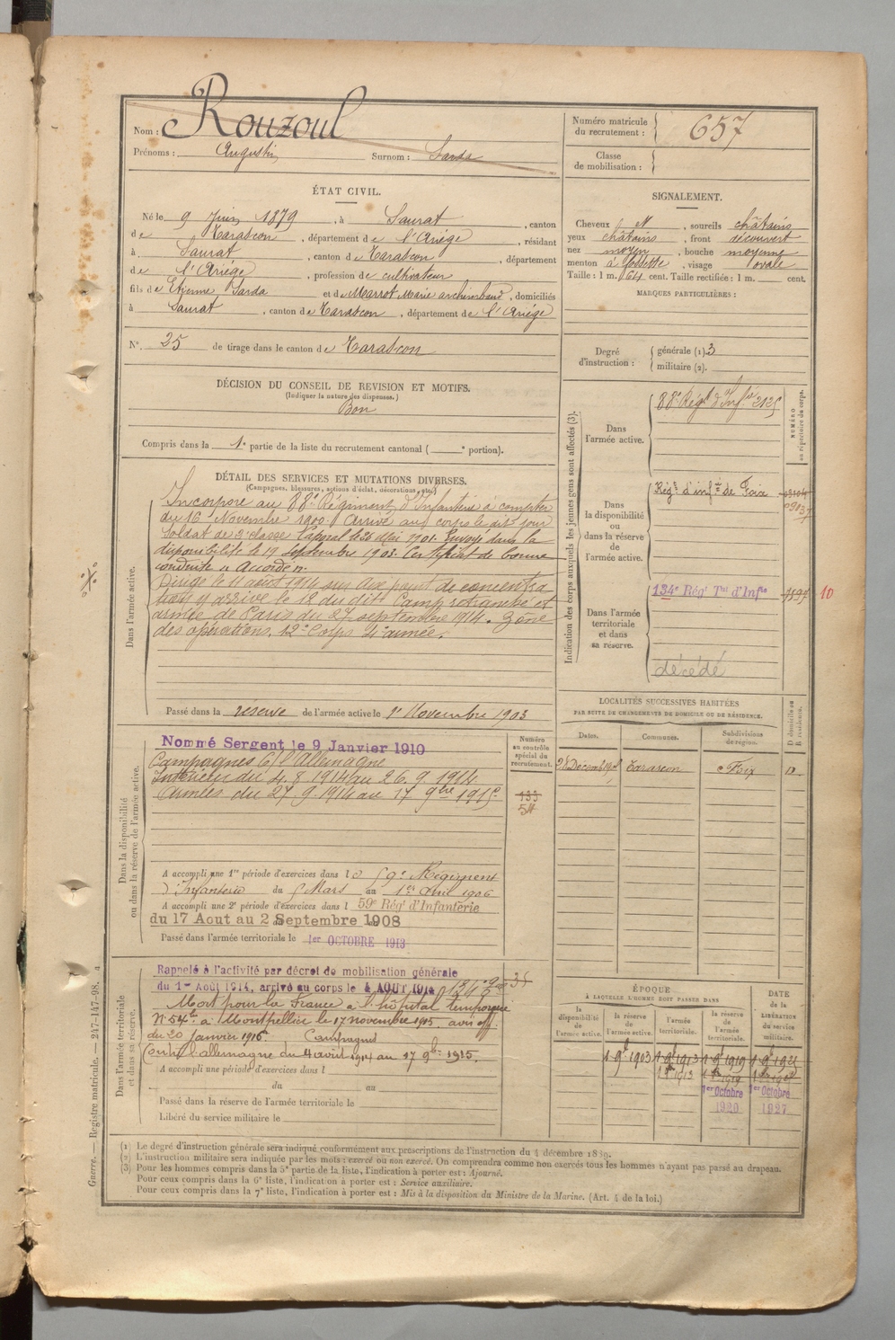 | Rouzoul | Augustin dit Sarda | FOIX | 1 R 457 | 1899 | Saurat | Saurat | 657 |
