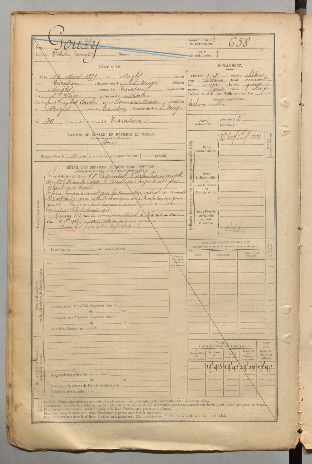| Gouzy | Volusien Edouard | FOIX | 1 R 457 | 1899 | Miglos | Miglos | 658 |