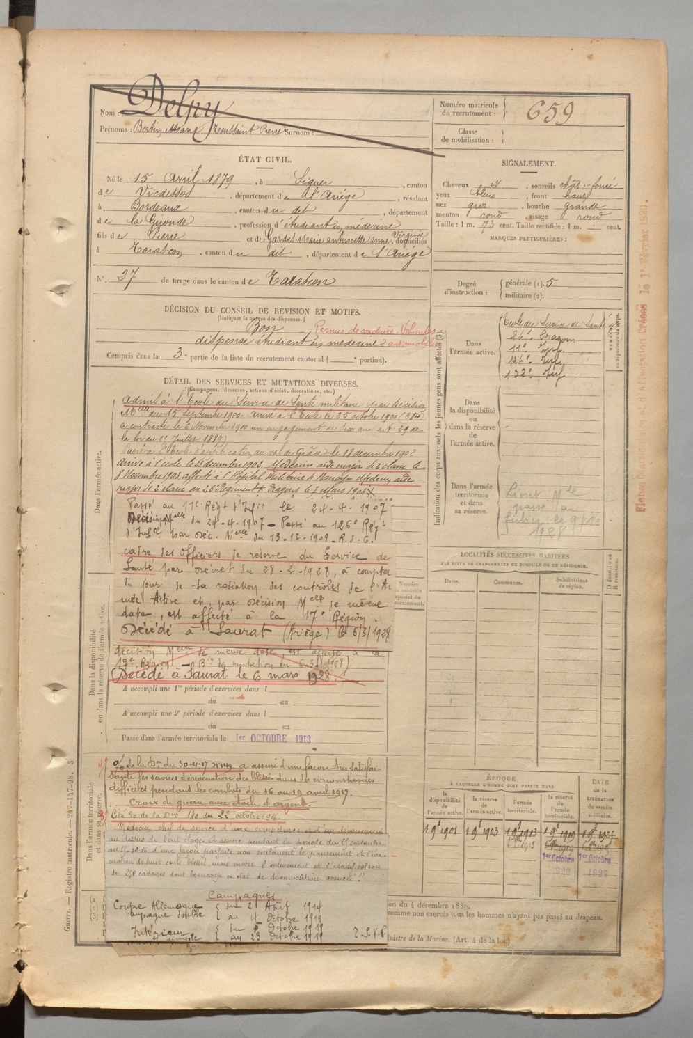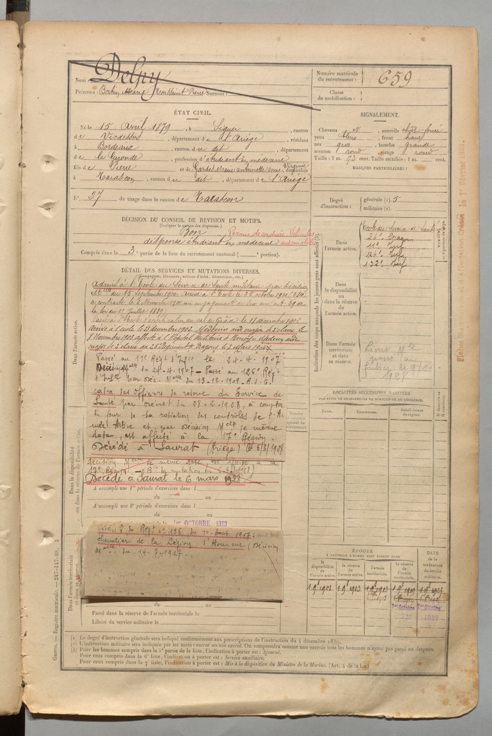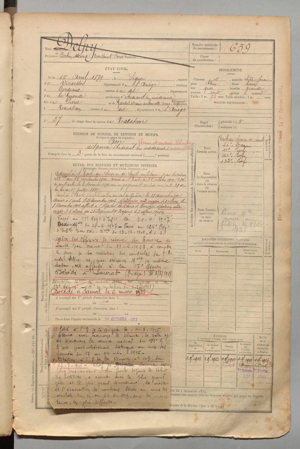 | Delpy | Bertin Marie Toussaint Pierre | FOIX | 1 R 457 | 1899 | Siguer | Bordeaux | 659 |