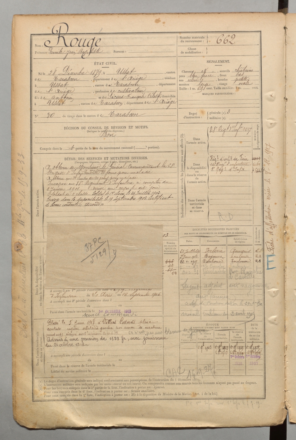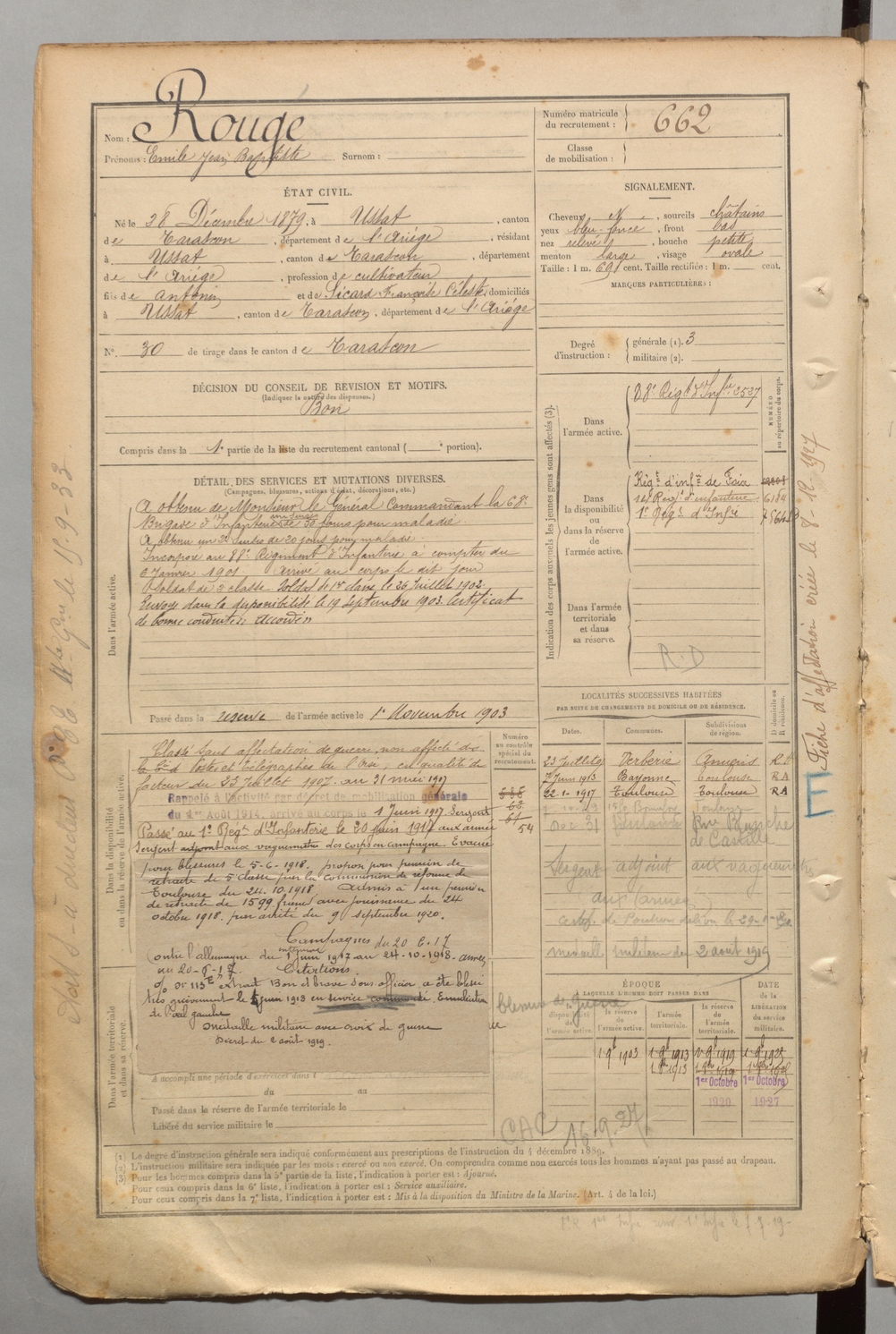 | Rouge | Emile Jean Baptiste | FOIX | 1 R 457 | 1899 | Ussat | Ussat | 662 |