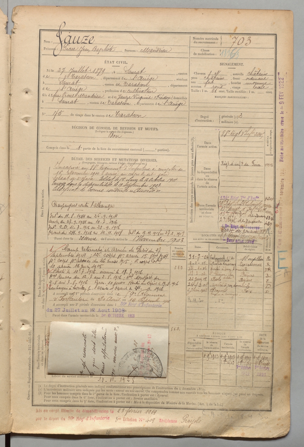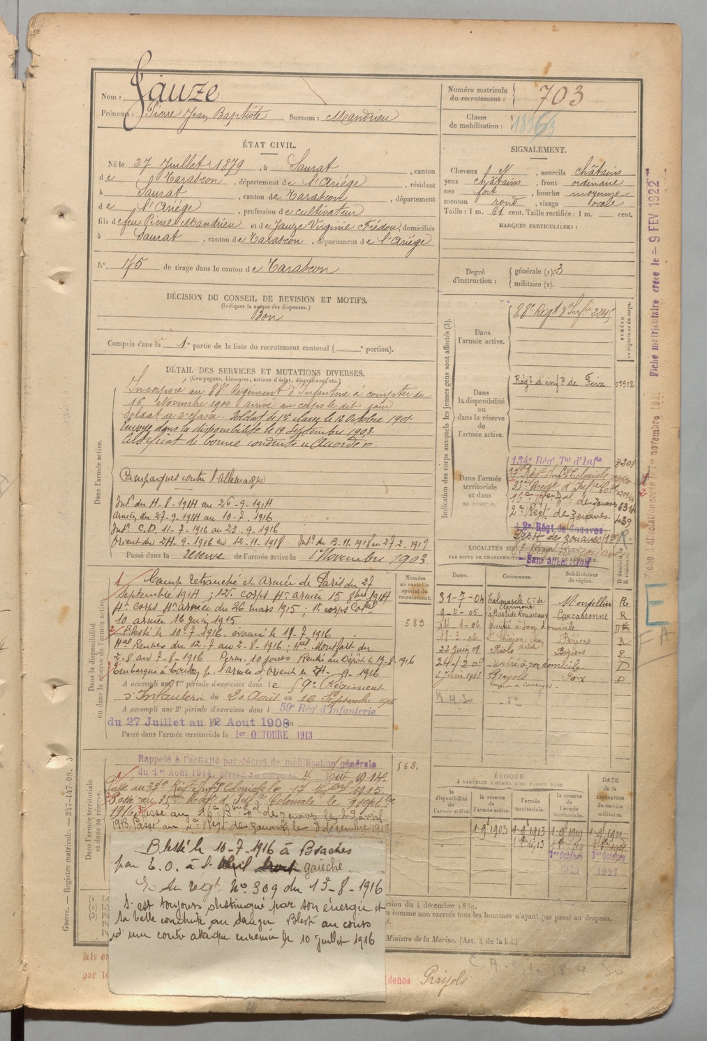 | Jauze | Pierre Jean Baptiste dit Mandrieu | FOIX | 1 R 457 | 1899 | Saurat | Saurat | 703 |