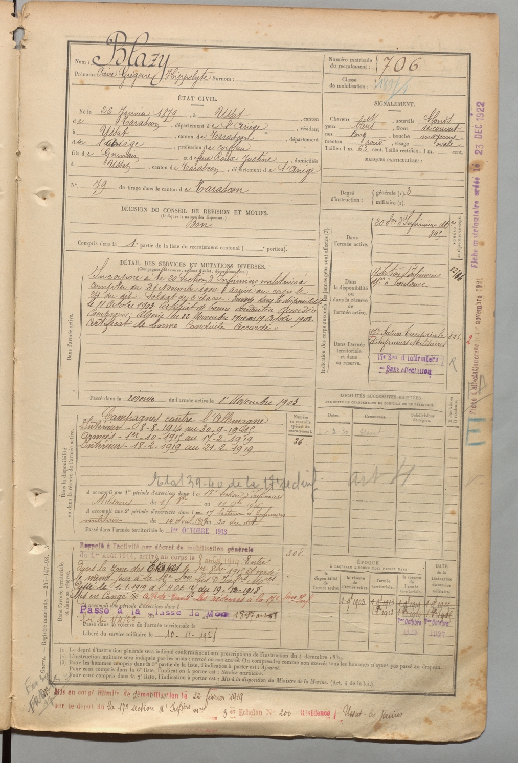 | Blazy | Pierre Grégoire Hippolyte | FOIX | 1 R 457 | 1899 | Ussat | Ussat | 706 |