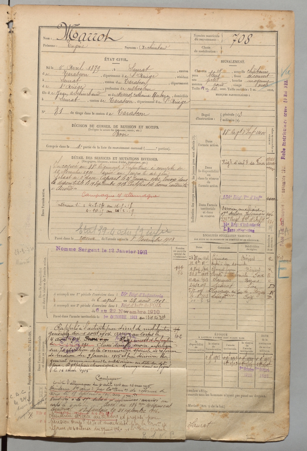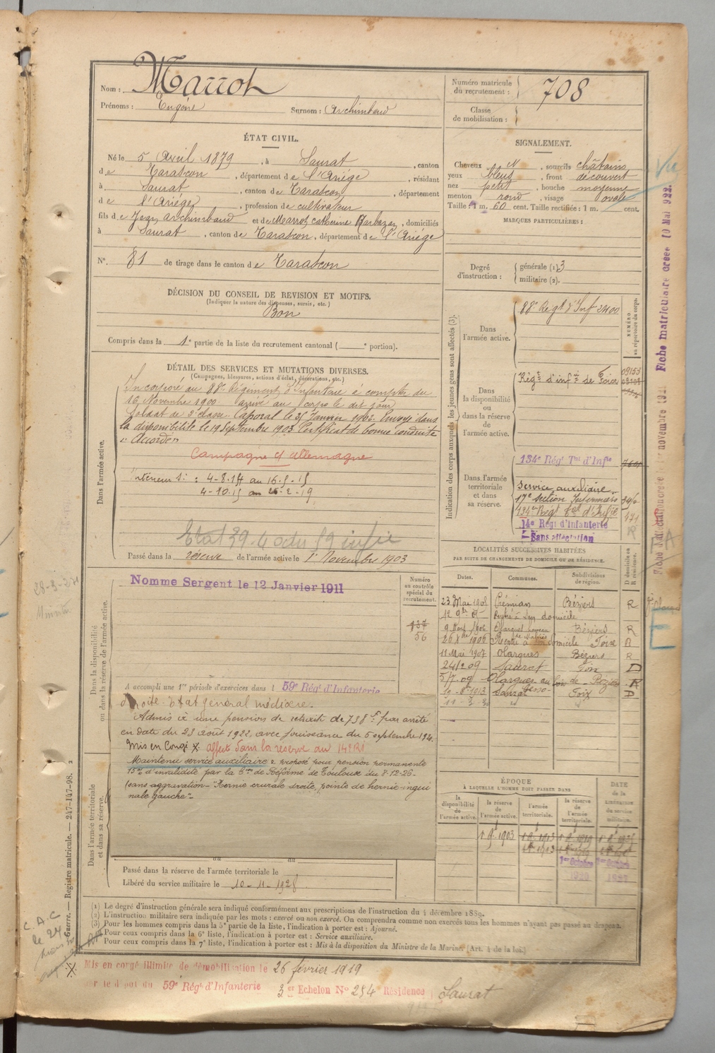 | Marrot | Eugène dit Archimbaud | FOIX | 1 R 457 | 1899 | Saurat | Saurat | 708 |