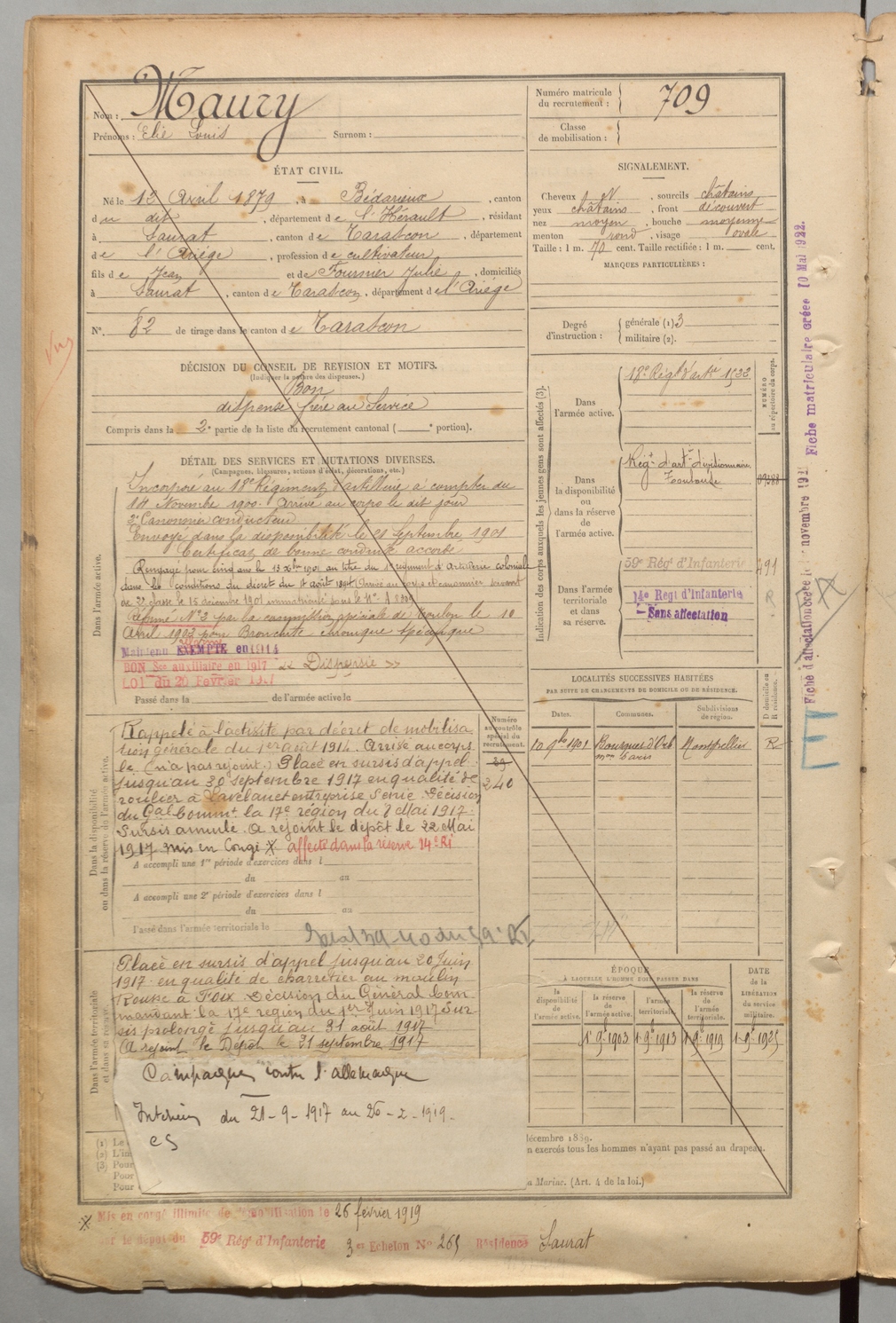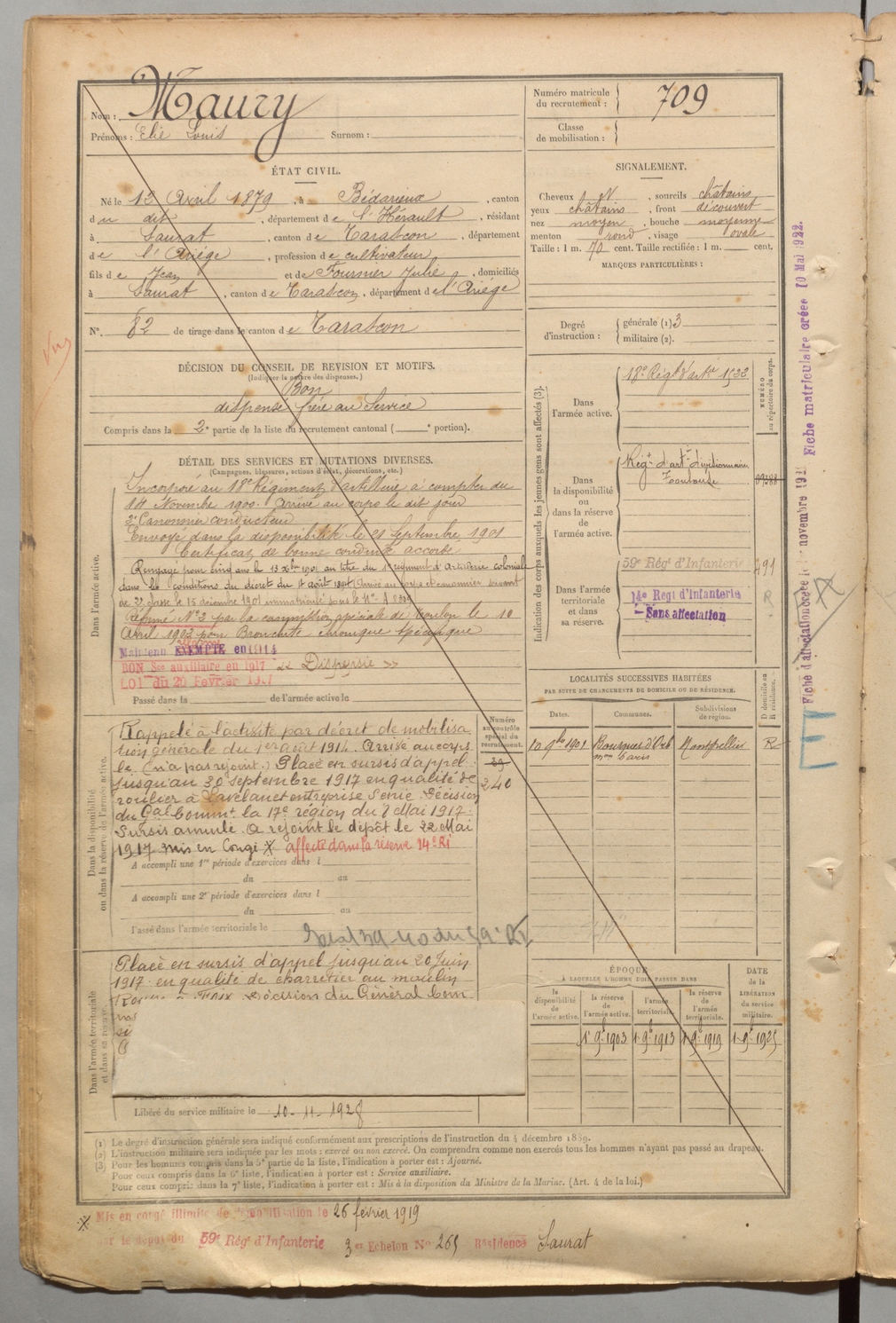 | Maury | Elie Louis | FOIX | 1 R 457 | 1899 | Bédarieux | Saurat | 709 |