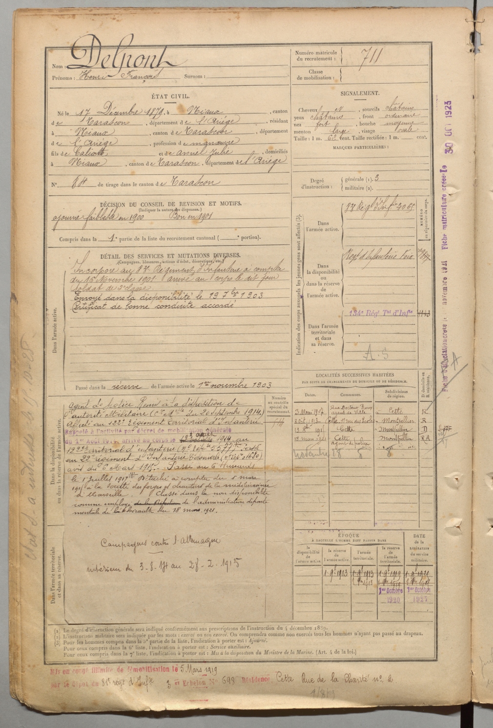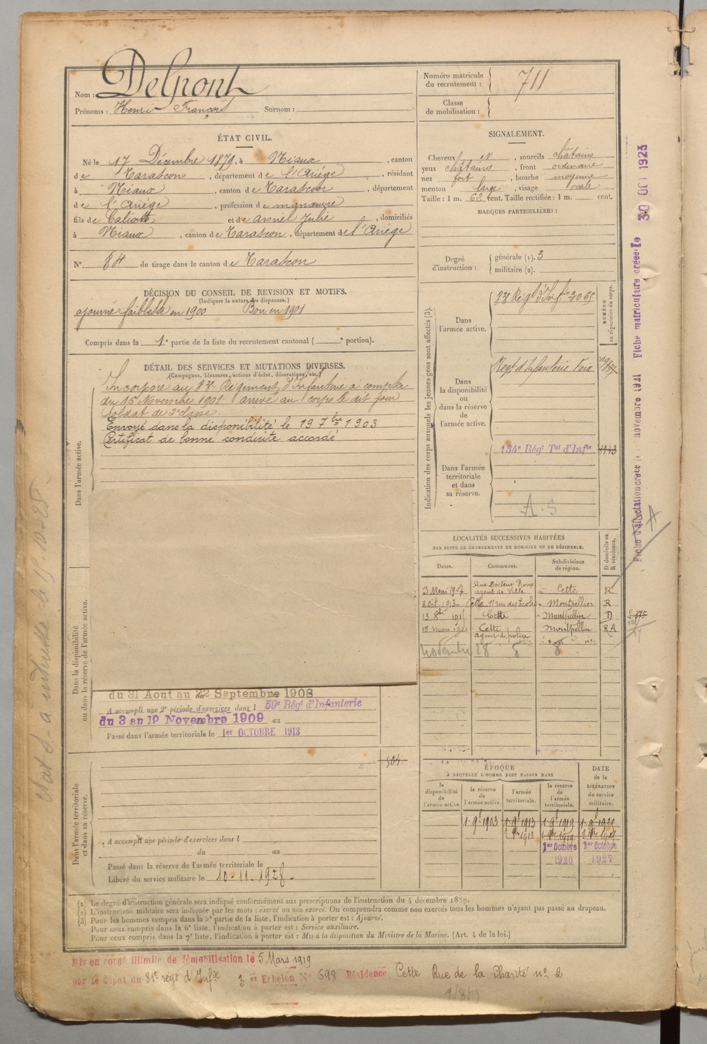 | Delpont | Henri François | FOIX | 1 R 457 | 1899 | Niaux | Niaux | 711 |