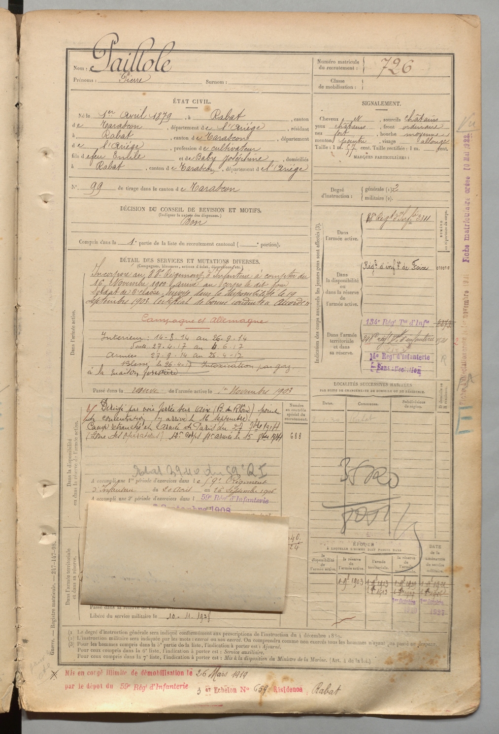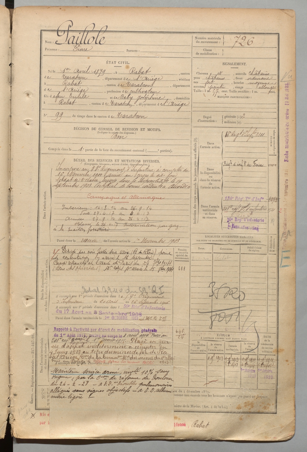 | Paillole | Pierre | FOIX | 1 R 457 | 1899 | Rabat-les-Trois-Seigneurs | Rabat-les-Trois-Seigneurs | 726 |