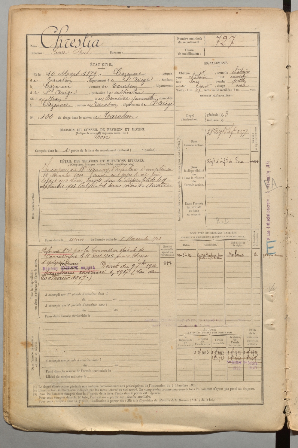 | Chrestia | Pierre Paul | FOIX | 1 R 457 | 1899 | Cazenave-Serres-et-Allens | Cazenave-Serres-et-Allens | 727 |