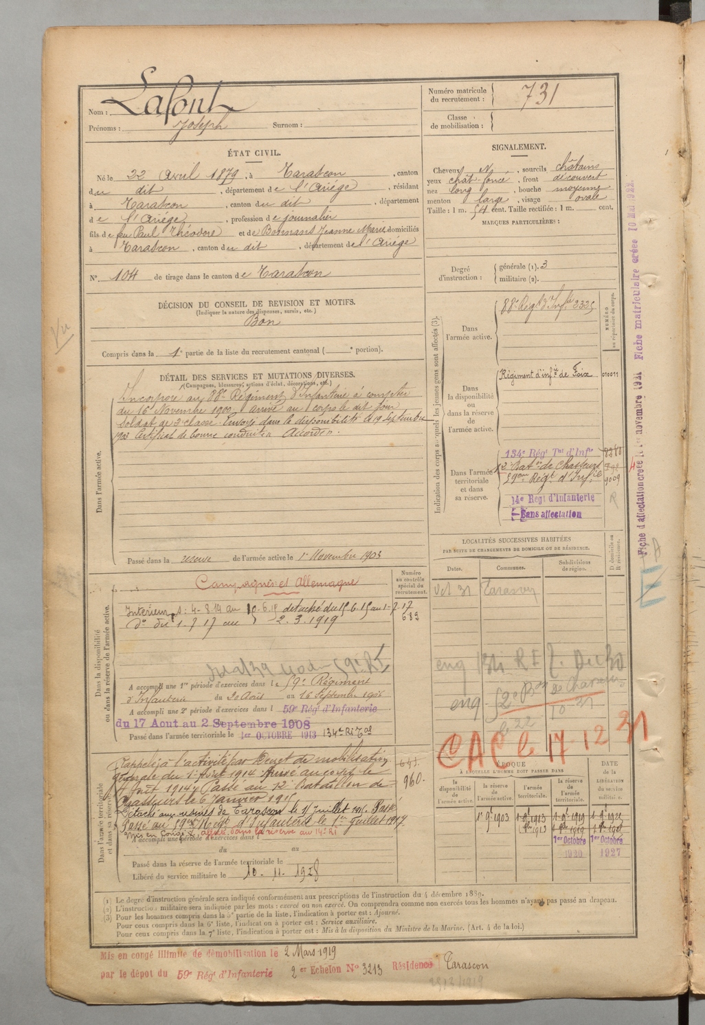 | Lafont | Joseph | FOIX | 1 R 457 | 1899 | Tarascon | Tarascon | 731 |