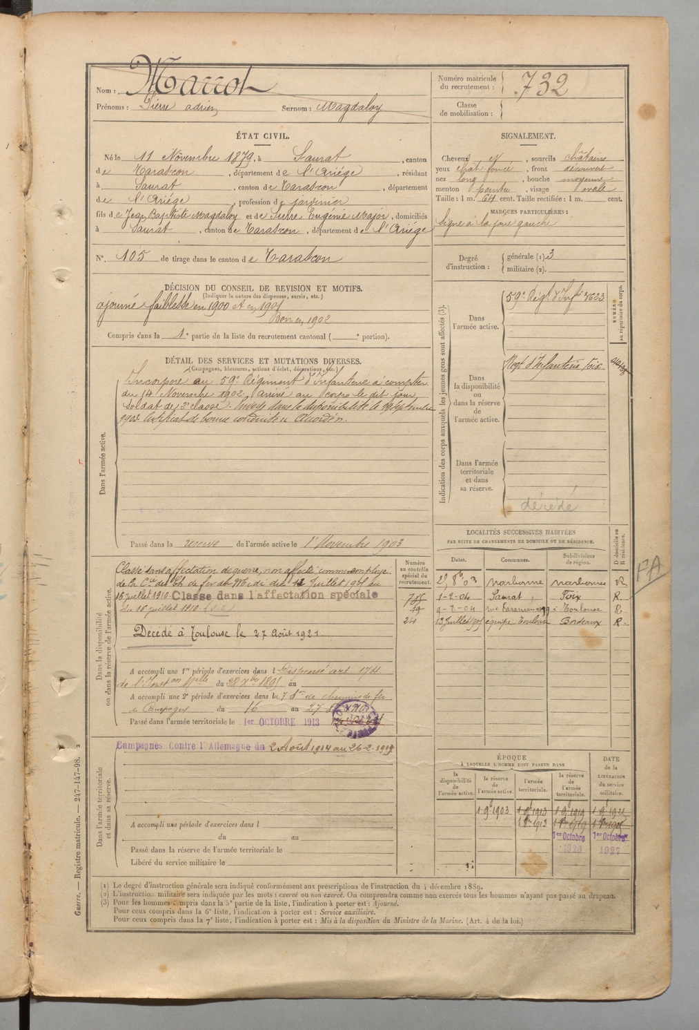 | Marrot | Pierre Adrien dit Magdaloy | FOIX | 1 R 457 | 1899 | Saurat | Saurat | 732 |