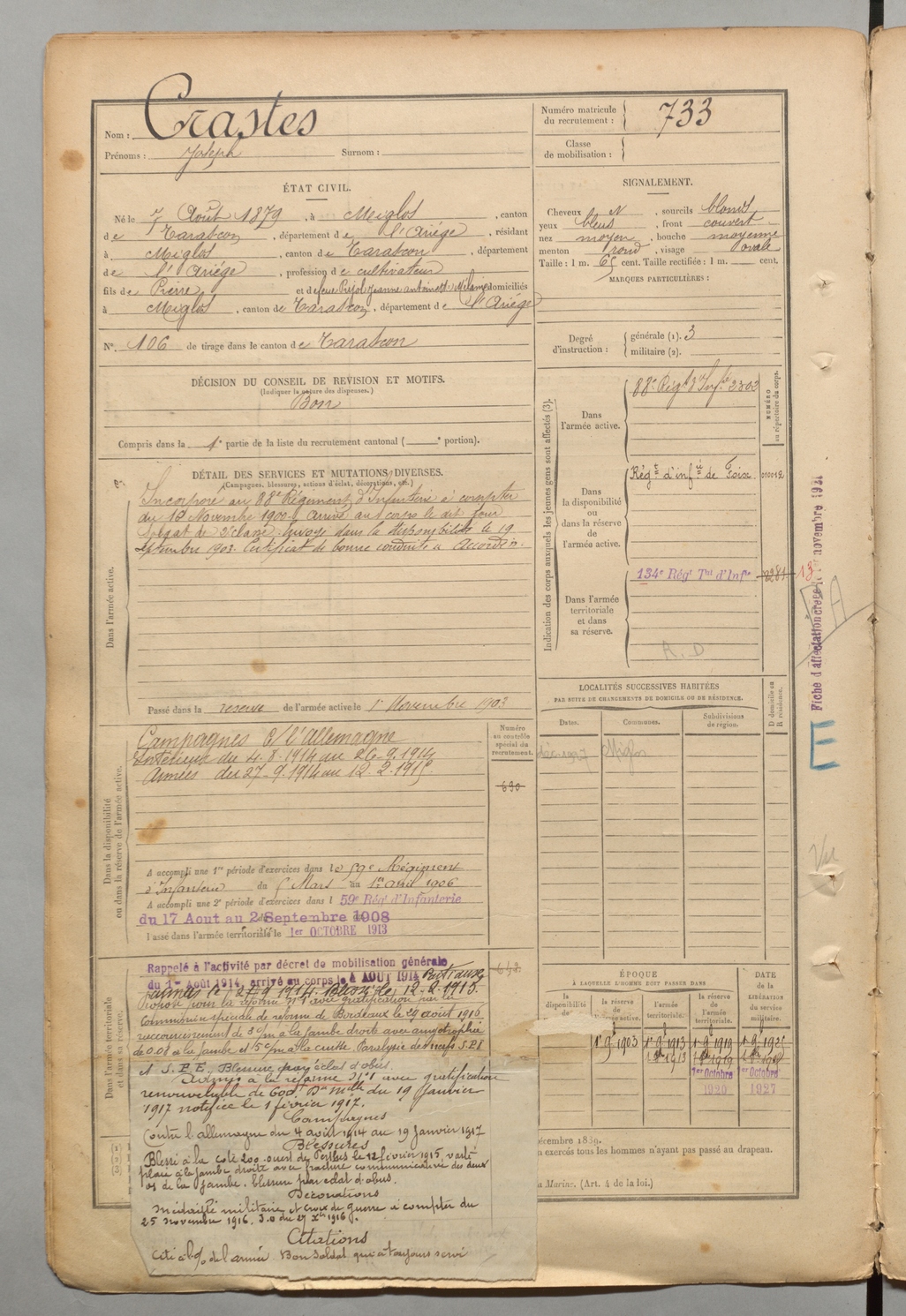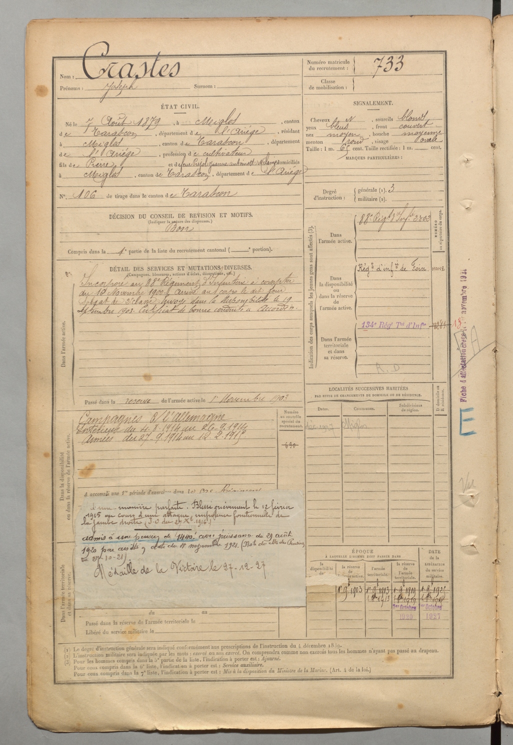 | Crastes | Joseph | FOIX | 1 R 457 | 1899 | Miglos | Miglos | 733 |