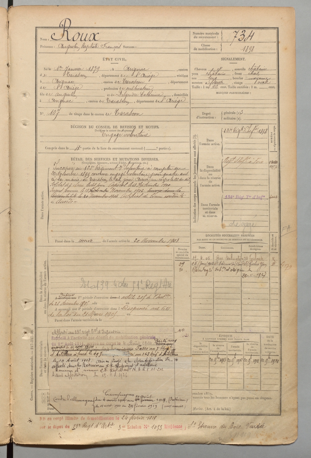 | Roux | Augustin Baptiste François | FOIX | 1 R 457 | 1899 | Arignac | Arignac | 734 |