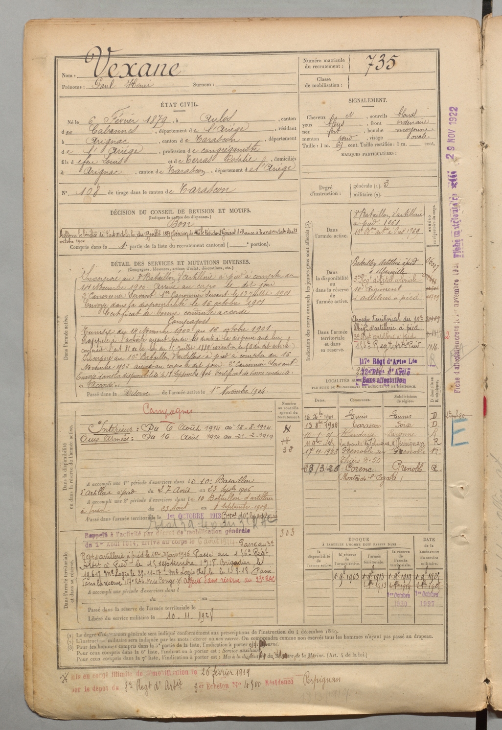 | Vexane | Paul Henri | FOIX | 1 R 457 | 1899 | Aulos | Arignac | 735 |