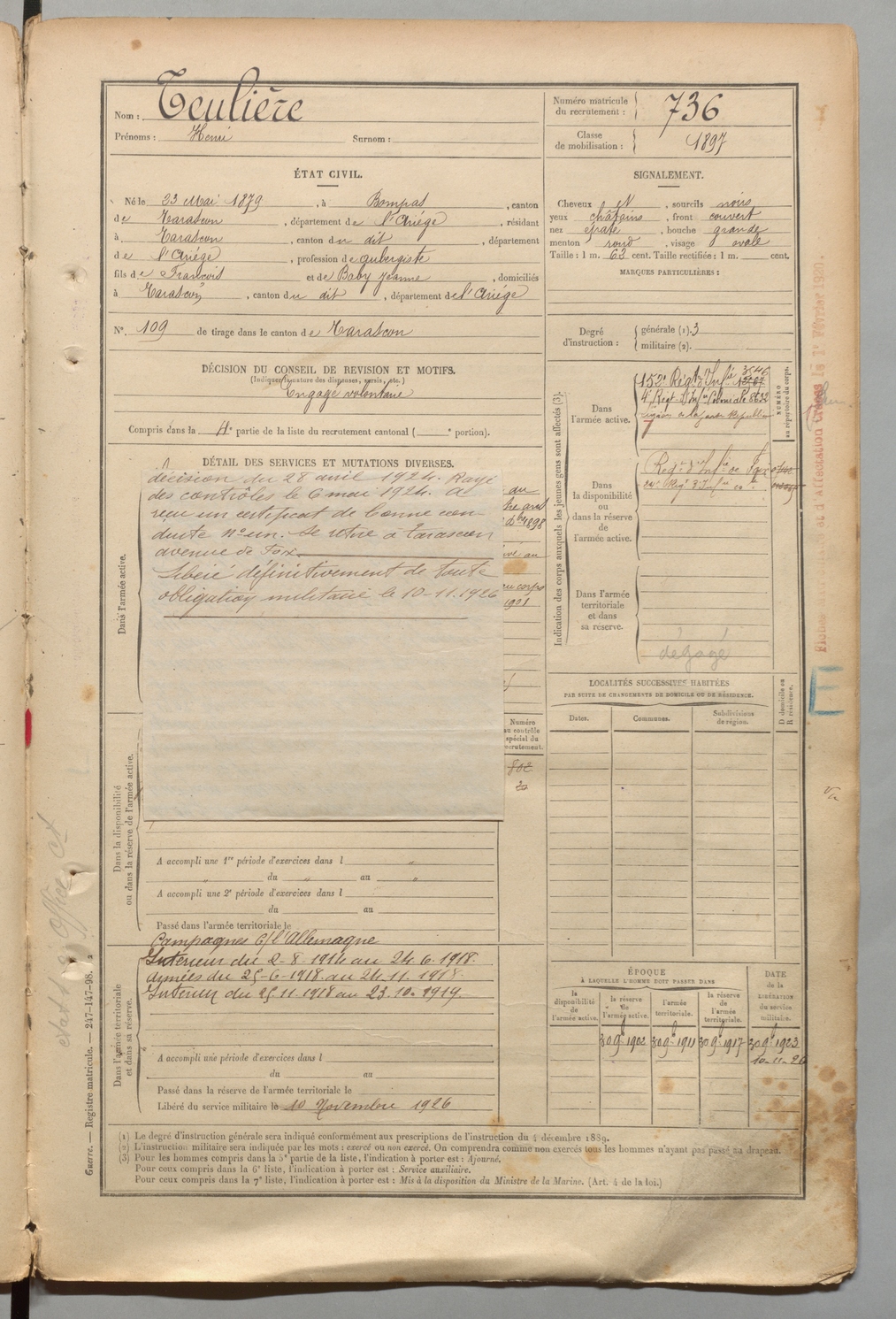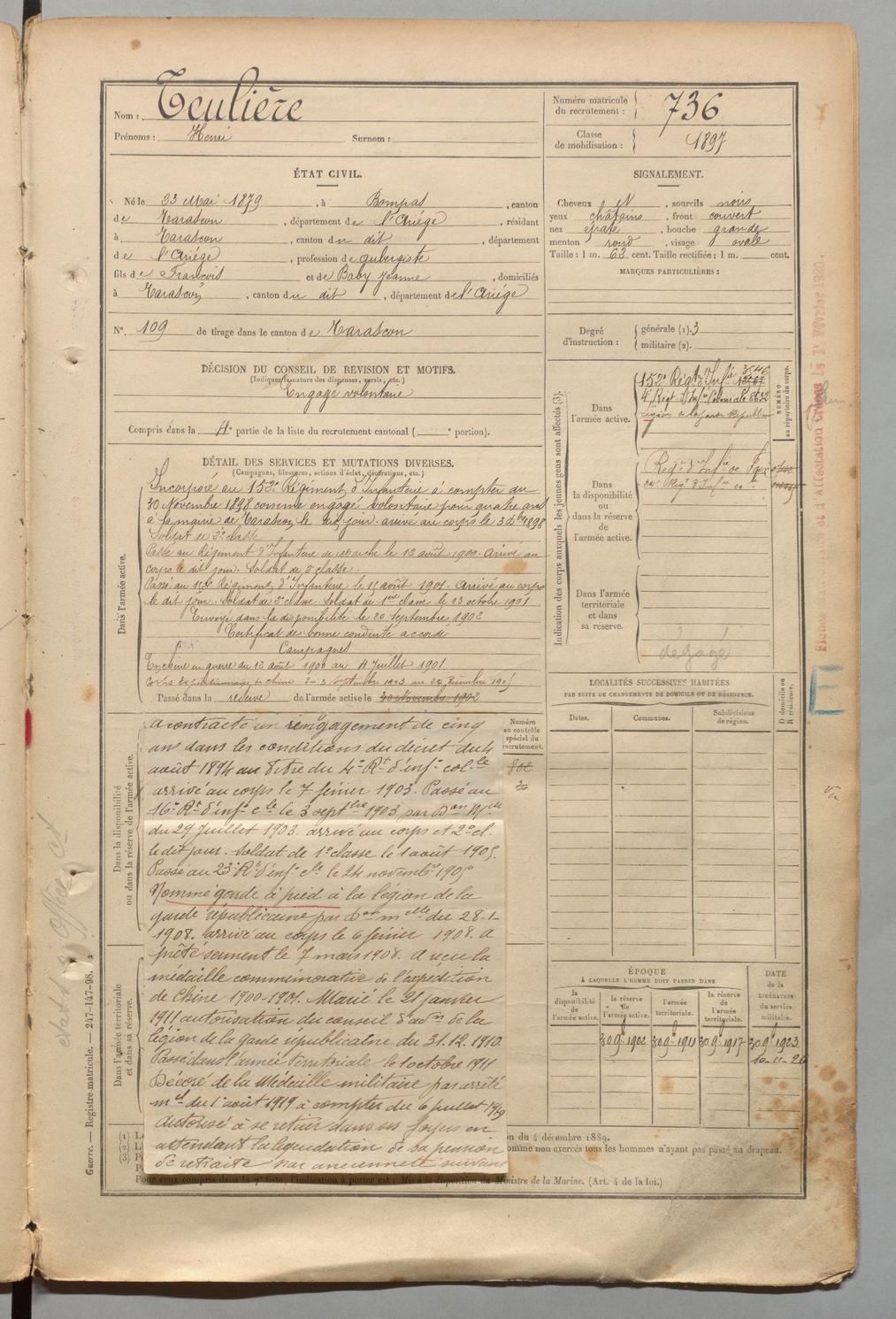 | Teulière | Henri | FOIX | 1 R 457 | 1899 | Bompas | Tarascon | 736 |