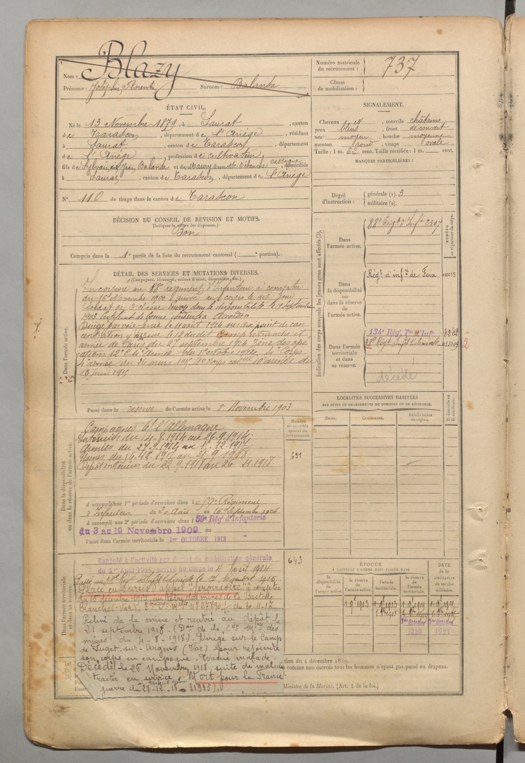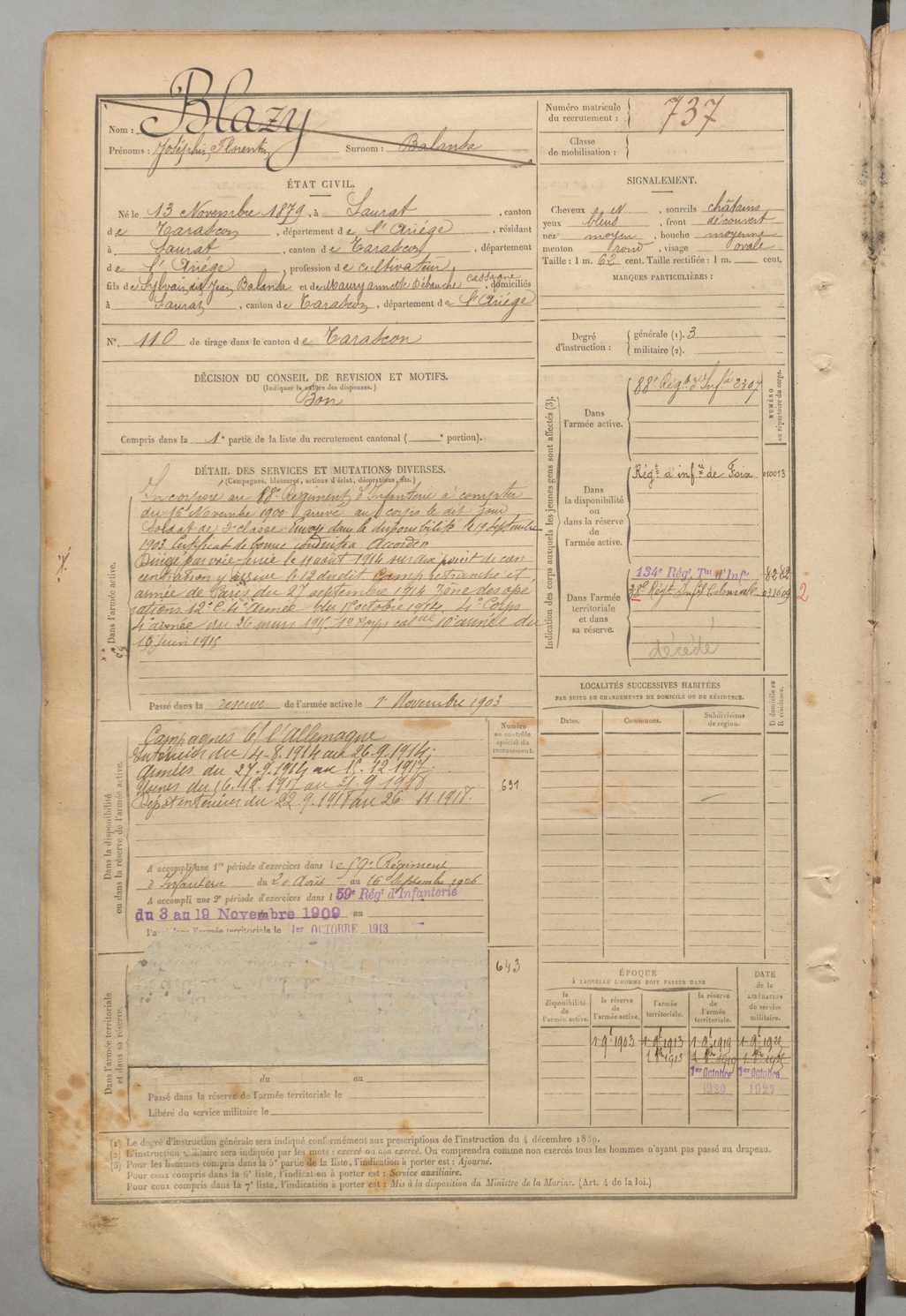 | Blazy | Joséphin Florentin dit Balansa | FOIX | 1 R 457 | 1899 | Saurat | Saurat | 737 |