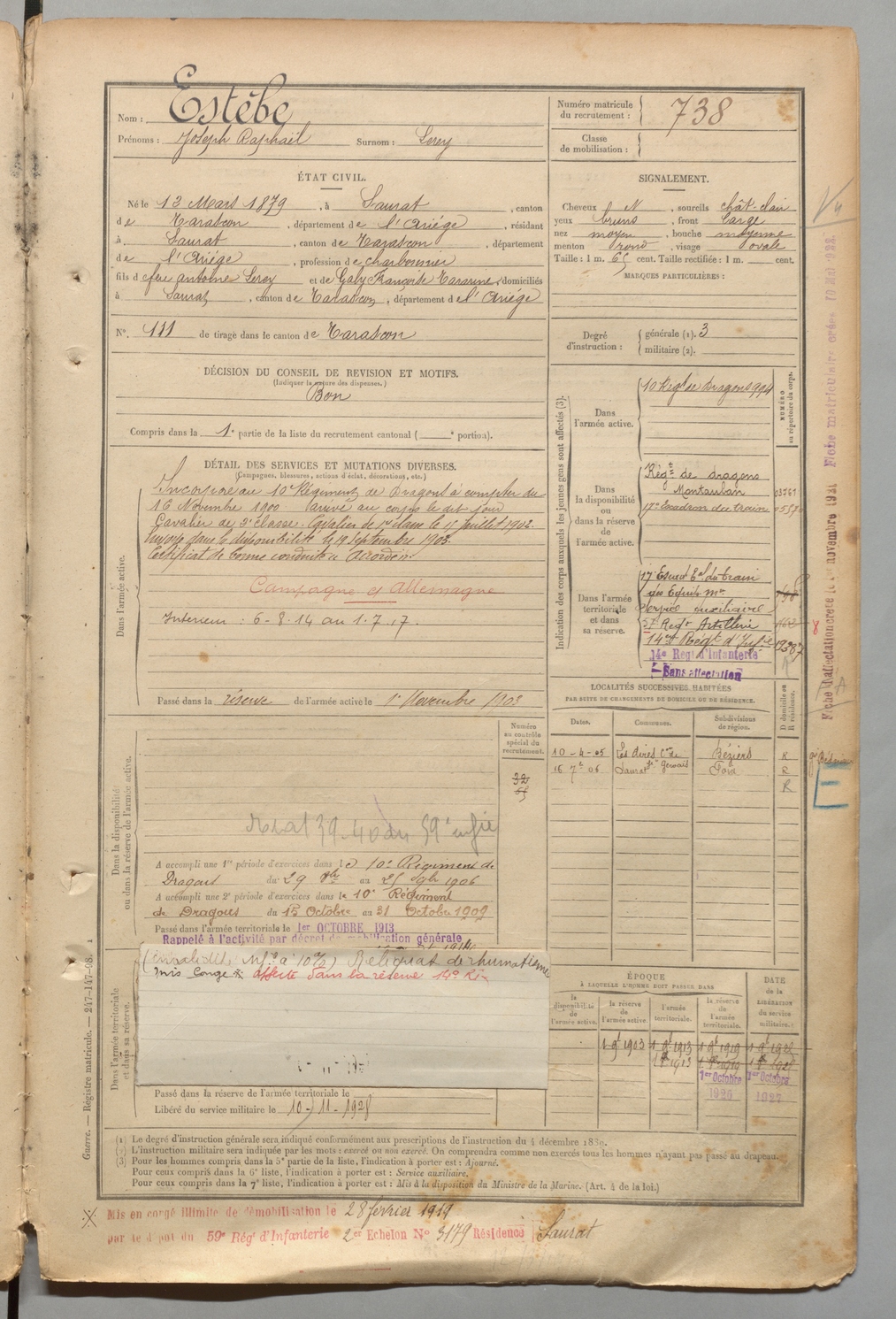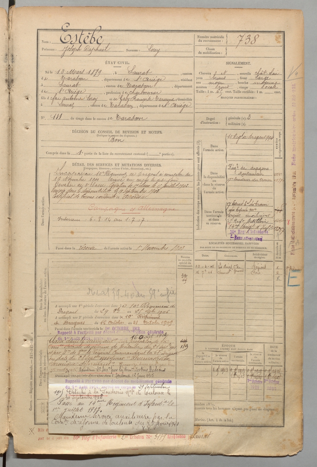 | Estèbe | Joseph Raphaël dit Lerey | FOIX | 1 R 457 | 1899 | Saurat | Saurat | 738 |