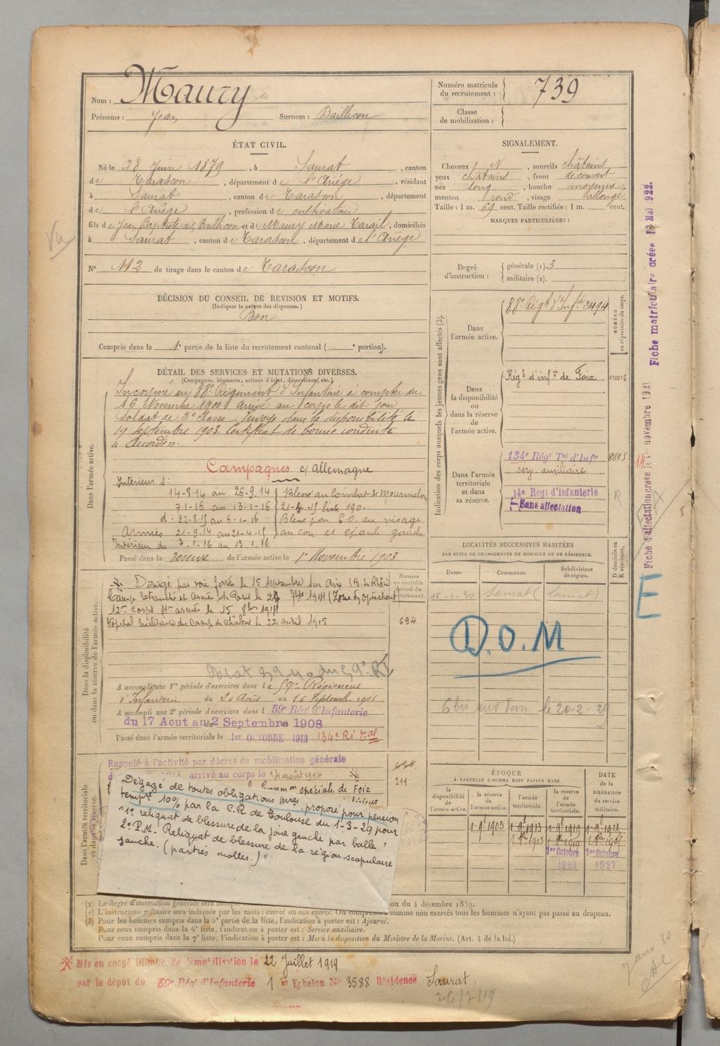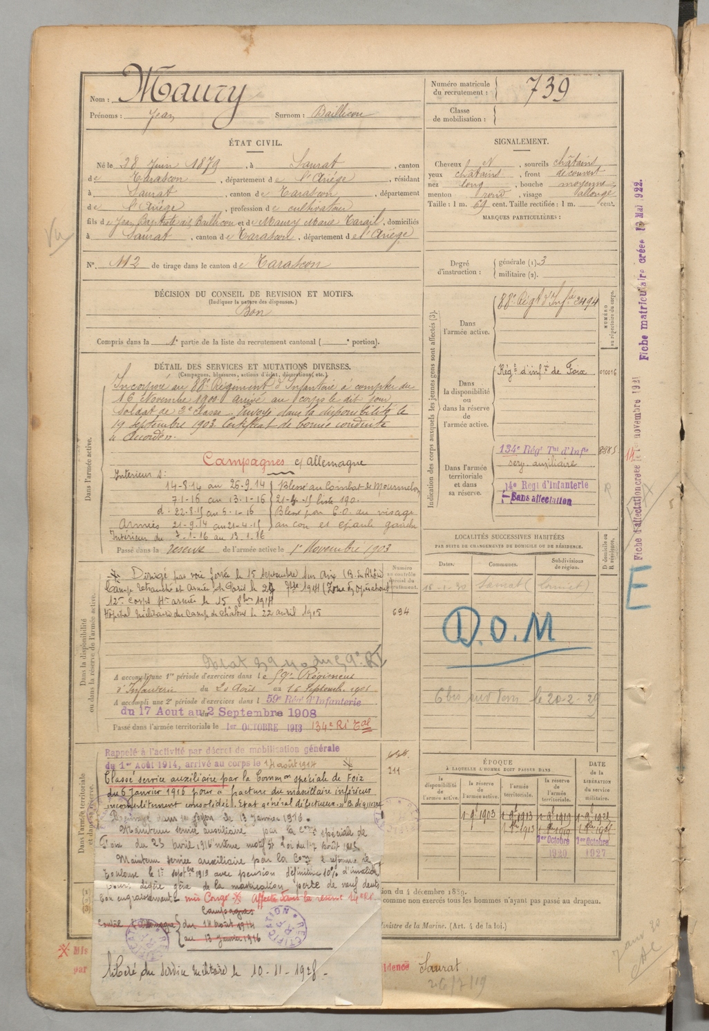 | Maury | Jean dit Baillicou | FOIX | 1 R 457 | 1899 | Saurat | Saurat | 739 |