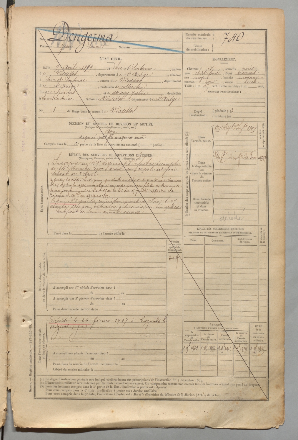 | Dengerma | Jean Laurent | FOIX | 1 R 457 | 1899 | Suc-et-Sentenac | Suc-et-Sentenac | 740 |