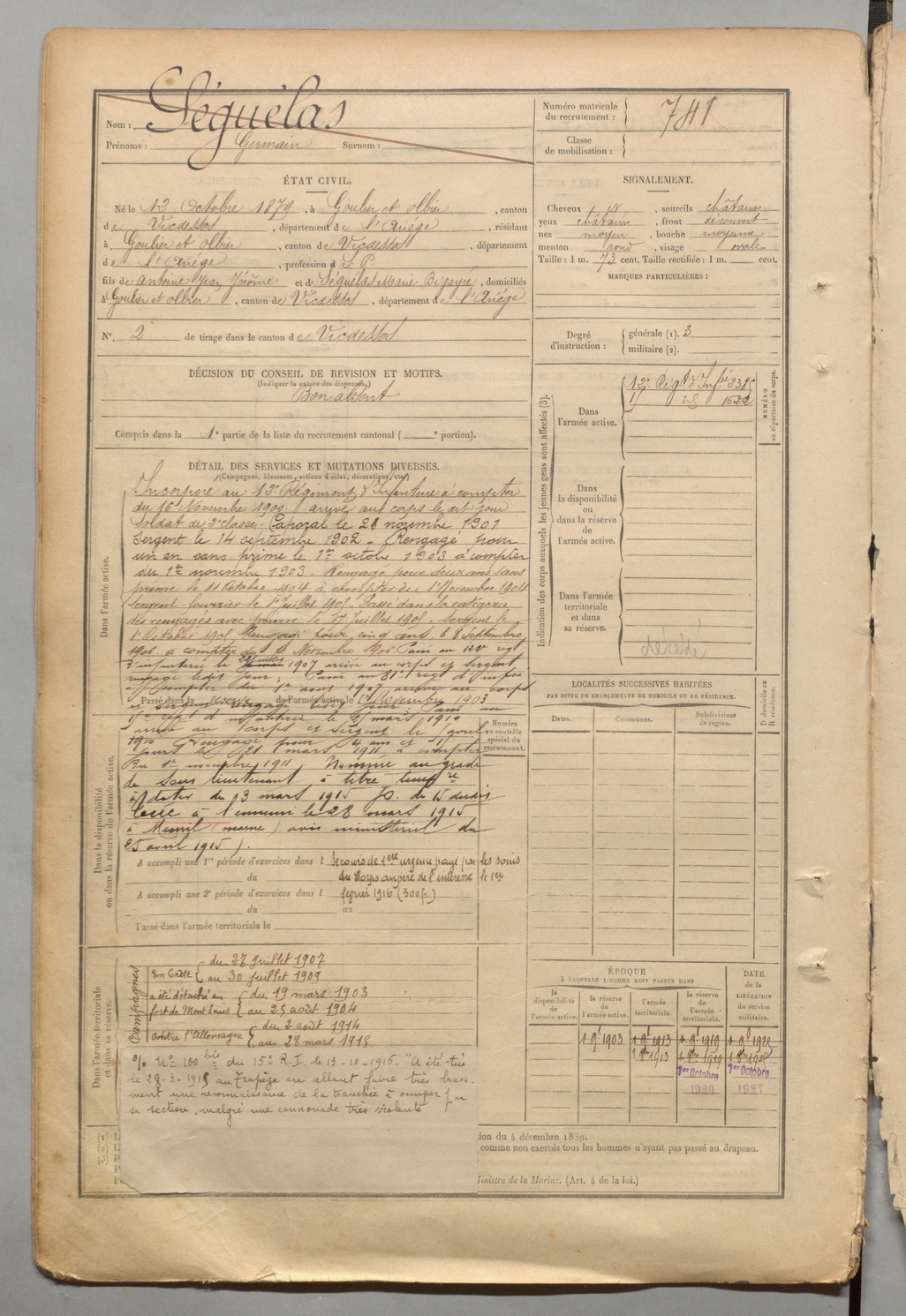 | Séguélas | Germain | FOIX | 1 R 457 | 1899 | Goulier-Olbier | Goulier-Olbier | 741 |