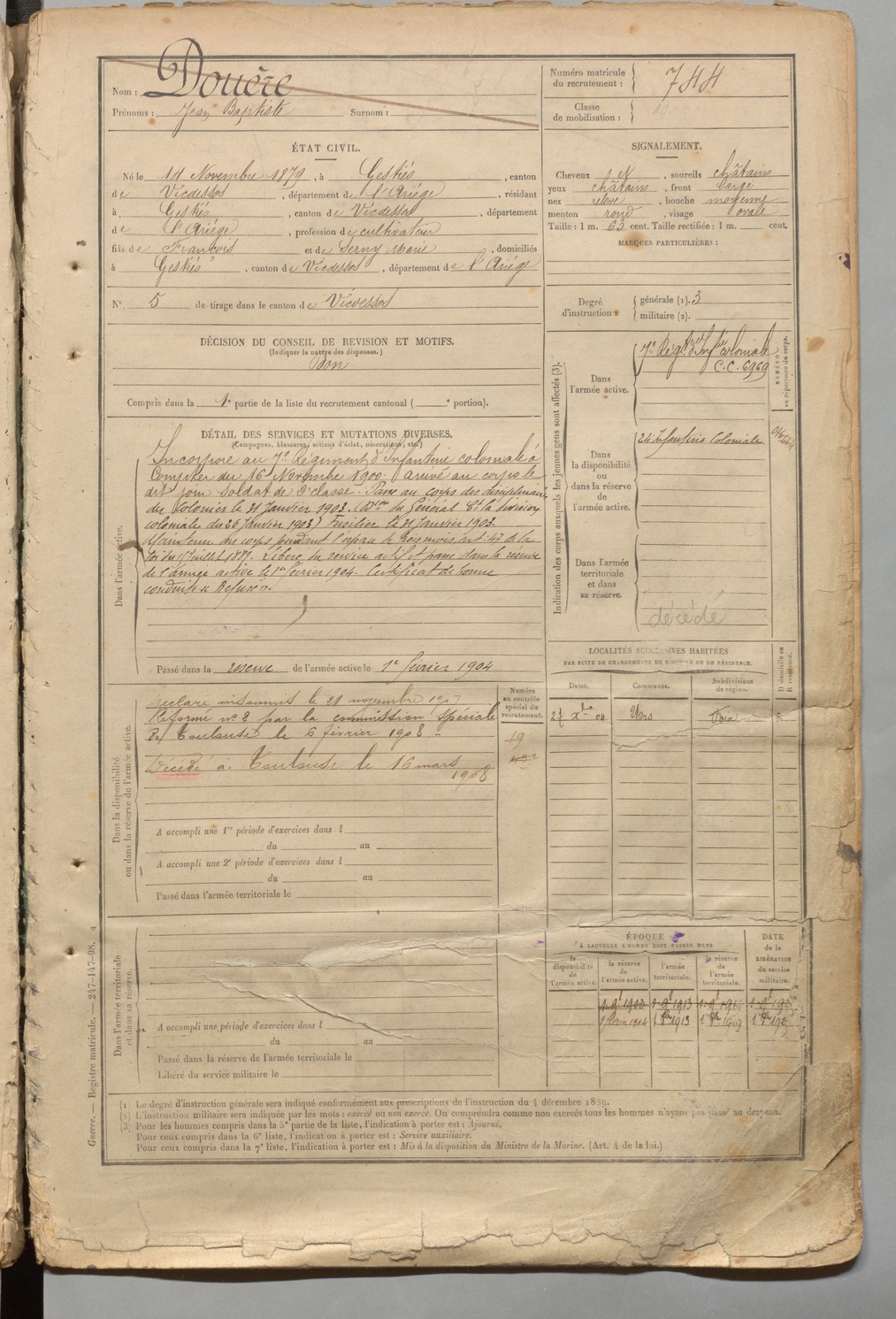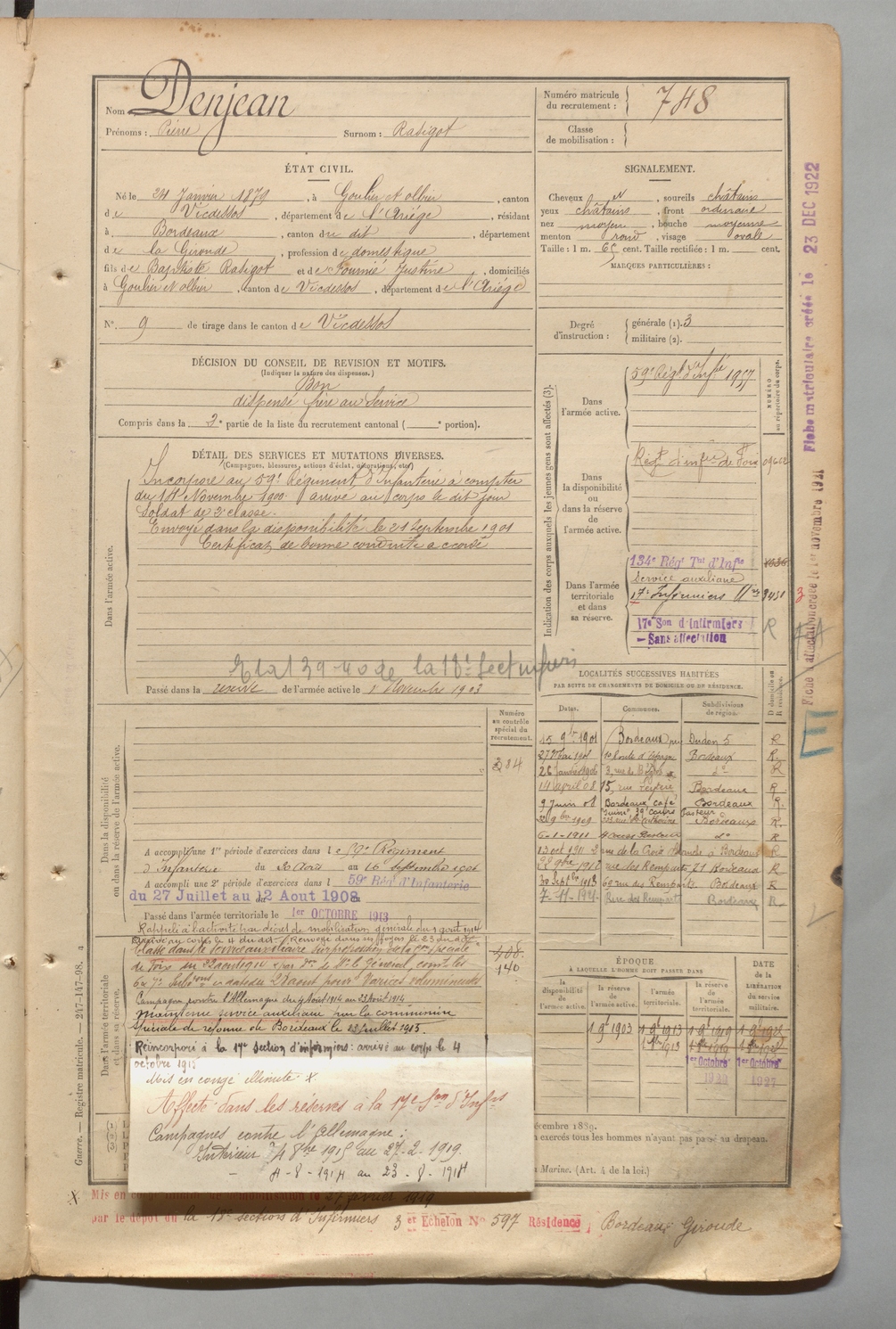 | Denjean | Pierre dit Rasigot | FOIX | 1 R 457 | 1899 | Goulier-Olbier | Bordeaux | 748 |