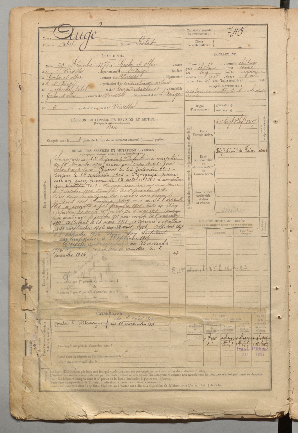 | Augé | Abel dit Palet | FOIX | 1 R 457 | 1899 | Goulier-Olbier | Goulier-Olbier | 745 |