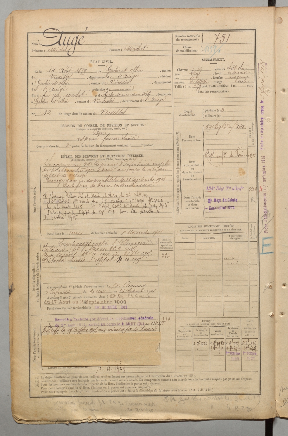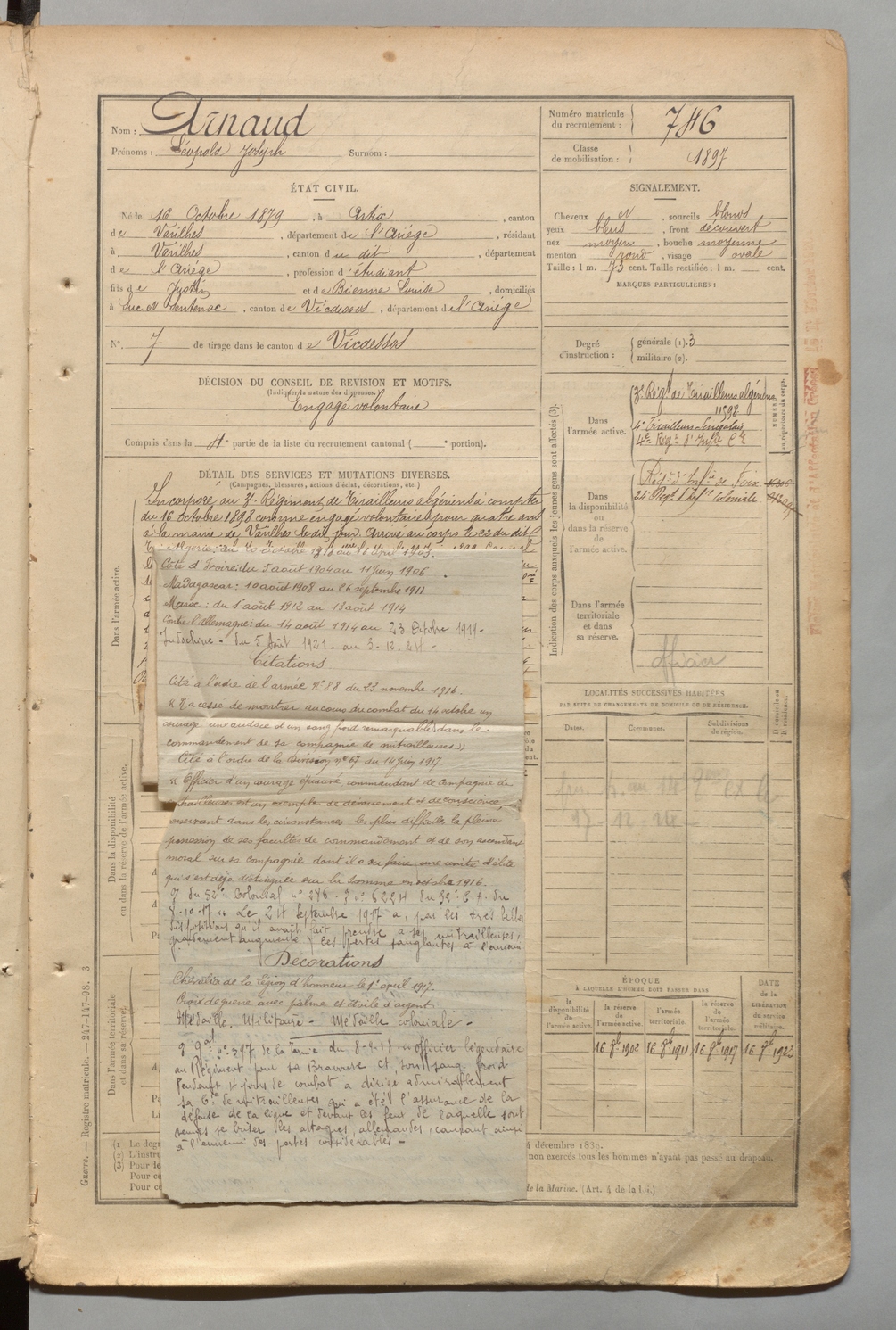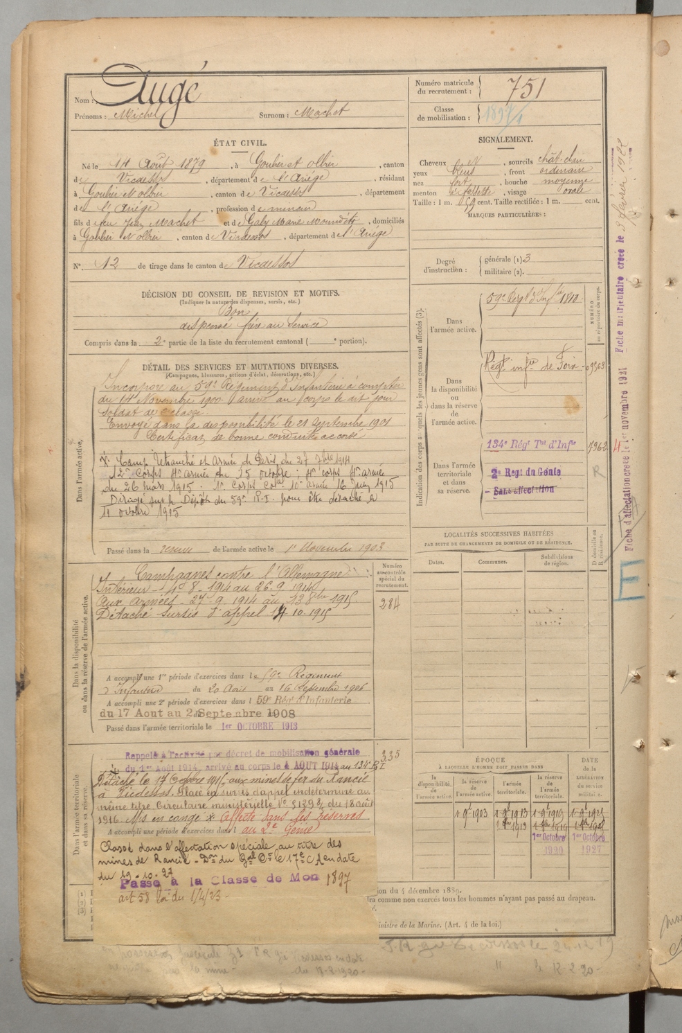 | Augé | Michel dit Machet | FOIX | 1 R 457 | 1899 | Goulier-Olbier | Goulier-Olbier | 751 |