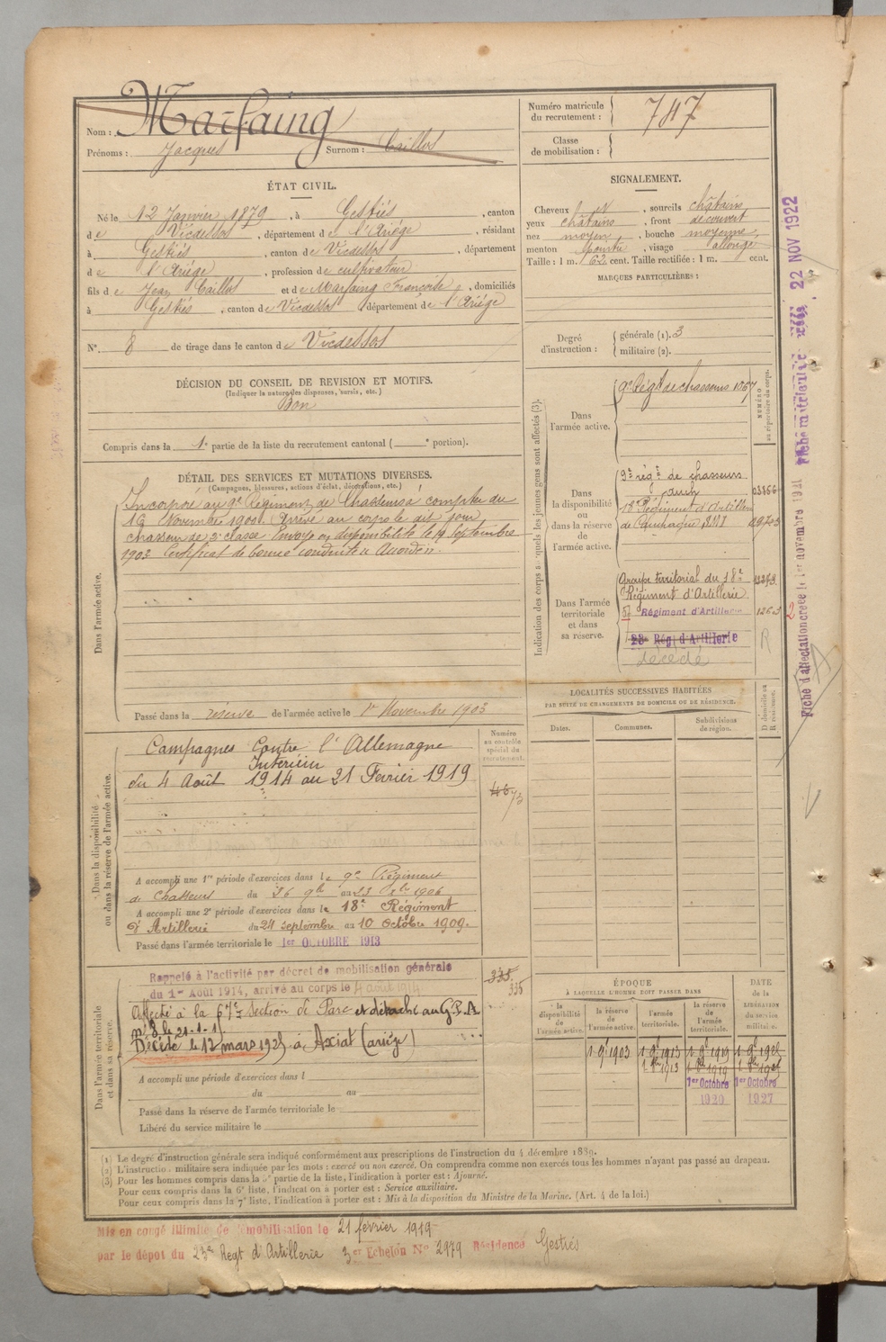 | Marfaing | Jacques dit Caillos | FOIX | 1 R 457 | 1899 | Gestiès | Gestiès | 747 |